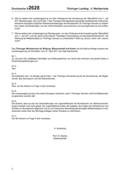 Drucksache 5/ 2628 Thüringer Landtag - 5. Wahlperiode 6. Gibt es seitens der Landesregierung vor dem Hintergrund der Aussetzung der Wehrpflicht zum 1. Juli 2011 Bestrebungen, die in § 30 Abs. 1 des Thüringer Schulgesetzes geregelte verpflichtende Unterrichts- teilnahme bezüglich möglicher Werbeveranstaltungen der Bundeswehr an Thüringer Schulen zu ändern bzw. diese Veranstaltungen von der Unterrichtspflicht auszunehmen und wie begründet sie ihre Auffas- sung? 7. Gibt es seitens der Landesregierung Überlegungen, vor dem Hintergrund der Aussetzung der Wehrpflicht zum 1. Juli 2011 und der damit verbundenen "freiwilligen Entscheidung zur Bundeswehrteilnahme", die Werbung für Militäreinsätze an Thüringer Schulen zu unterbinden? Wenn ja, warum, wenn nein, warum nicht? Das Thüringer Ministeriums für Bildung, Wissenschaft und Kultur hat die Kleine Anfrage namens der Landesregierung mit Schreiben vom 27. April 2011 wie folgt beantwortet: Zu 1.: Ja, sie kennt die vielfältigen Aktivitäten und Stellungnahmen von terres des hommes und bezieht diese in Entscheidungsfindungen ein. Zu 2.: nein Zu 3.: Grundsätzlich nein. Im Übrigen gilt § 6 Abs. 1 der Thüringer Schulordnung für die Grundschule, die Regel- schule, das Gymnasium und die Gesamtschule. Zu 4.: Nein; auf die Antwort zu Frage 3 wird verwiesen. Zu 5.: Die Landesregierung kann hier keine Divergenz erkennen, weil in Thüringer Schulen nicht für Militäreinsät- ze geworben werden darf. Zu 6.: Die Ansicht, dass es sich bei Veranstaltungen mit Jugendoffizieren der Bundeswehr um Werbeveranstal- tungen handelt, wird nicht geteilt. Die Jugendoffiziere haben die Aufgabe, die Fragen der Schülerinnen und Schüler zur Bundeswehr allgemein und zu vom Deutschen Bundestag genehmigten Militäreinsätzen zu be- antworten sowie über die Rechtsgrundlagen dieser Einsätze zu informieren. Zu 7.: Auf die Antwort zu Frage 6 wird verwiesen. In Vertretung Prof. Dr. Merten Staatssekretär 2