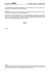 THÜRINGERLandtag Thüringer LANDTAG - 4. Wahlperiode Drucksache 4/ 2441 4. Wahlperiode 13.11.2006 Kleine Anfrage des Abgeordneten Dr. Pidde (SPD) und Antwort des Thüringer Ministeriums für Bau und Verkehr Stand der Bewilligungen und des Mittelabflusses bei den Förderprogrammen in Zuständigkeit des Thüringer Ministeriums für Bau und Verkehr Die Kleine Anfrage 1005 vom 29. September 2006 hat folgenden Wortlaut: Zur Kontrolle des Haushaltsvollzugs bietet sich u.a. die Überprüfung des Standes der Bewilligungen und des Mittelabflusses bei den einzelnen im Haushalt veranschlagten Förderprogrammen an. Ich frage die Landesregierung: 1. Wie stellt sich der Stand der Bewilligungen und des Mittelabflusses mit Stand 30. September 2006 bei den Förderprogrammen in Zuständigkeit des Thüringer Ministeriums für Bau und Verkehr in absoluten und prozentualen Zahlen im Vergleich zum Haushaltssoll dar? (Es wird um Angabe in Form einer Tabelle mit folgenden Spalten gebeten: • Kapitel/Titel • Zweckbestimmung und Angabe der Förderrichtlinie mit Veröffentlichungsdatum • Haushaltsansatz 2006 in Euro • Haushaltsreste, die zu Lasten des Ansatzes gehen, in Euro [Fälle, in denen auch die Mittel des Vorjahres in das Jahr 2006 übertragen wurden - und damit zusätzlich zum Haushaltsansatz zur Ver- fügung stehen -, bitte kennzeichnen] • Stand der Bewilligung 2006 [einschließlich VE der Vorjahre zu Lasten des HH-Jahres] in Euro • Stand der Bewilligung zu Lasten 2006 insgesamt in Euro • Stand der Bewilligung in Prozent • Stand des Mittelabflusses in Euro • Stand des Mittelabflusses in Prozent • vom Haushaltsansatz mit Sperre belegt bzw. der Bewirtschaftungsreserve unterliegend in Euro • vom Haushaltsansatz mit Sperre belegt bzw. der Bewirtschaftungsreserve unterliegend in Prozent) 2. Was sind im Detail die Ursachen für die unter 1. aufgeführten - unter 70 Prozent der verfügbaren Bewil- ligungssumme liegenden - Bewilligungsstände (es wird um eine Begründung zu jedem einzelnen in Frage kommenden Förderprogramm gebeten)? Druck: Thüringer Landtag, 21. November 2006 1