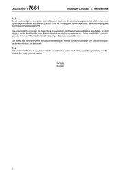 Drucksache 5/ 7661 Thüringer Landtag - 5. Wahlperiode Zu 3.: Es ist beabsichtigt, in den ersten sechs Monaten nach der Umstrukturierung zunächst wöchentlich zwei Sprechtage in Weimar abzuhalten. Danach wird der Umfang der Sprechtage unter Berücksichtigung des Nachfrageverhaltens überprüft. Das ursprüngliche Ansinnen, die Sprechtage im Bürgerbüro der Stadtverwaltung Weimar abzuhalten, ist nicht möglich, da die Stadt hierfür keine Räumlichkeiten zur Verfügung stellen kann. Daher werden die Sprechta- ge weiterhin in den Räumlichkeiten der bisherigen Servicestelle stattfinden. Ziel ist es, das Serviceangebot der Steuerverwaltung in Weimar aufrechtzuerhalten und die Servicequali- tät bürgerfreundlich zu gestalten. Zu 4.: Frei werdende Räume in der Jenaer Straße 2a in Weimar sollen nach Umbau und Neugestaltung von Be- hörden der Justiz genutzt werden. Dr. Voß Minister 2