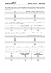 Drucksache 5/ 5017 Thüringer Landtag - 5. Wahlperiode Die Anzahl der bei den Thüringer Staatsanwaltschaften eingeleiteten Ermittlungsverfahren wegen Strafta- ten gegen die sexuelle Selbstbestimmung - unabhängig vom Geschlecht des Opfers - ergibt sich aus nach- stehender Tabelle: Jahr Anzahl der eingeleiteten Ermittlungsverfahren 2005 481 2006 792 2007 853 2008 781 2009 767 2010 816 2011 739 Angaben zu der Anzahl der durch Straftaten gegen die sexuelle Selbstbestimmung Geschädigten weibli- chen Geschlechts liegen erst ab dem Jahr 2009 vor: Jahr Anzahl Geschädigter davon unter 18 Jahren weiblichen Geschlechts 2009 623 373 2010 728 482 2011 723 481 Die Anzahl der Ermittlungsverfahren wegen Straftaten gegen die sexuelle Selbstbestimmung, die einge- stellt wurden, ergibt sich aus nachstehender Tabelle: Jahr Anzahl der Verfahrenseinstellungen 2005 304 2006 471 2007 593 2008 502 2009 566 2010 552 2011 506 Zu der Anzahl der Ermittlungsverfahren im Zusammenhang mit häuslicher Gewalt gegen weibliche Opfer und der Einstellungen entsprechender Verfahren liegen der Landesregierung keine statistischen Angaben vor. Die Anzahl der eingeleiteten Ermittlungsverfahren und Einstellungen von Verfahren im Zusammenhang mit häuslicher Gewalt - unabhängig vom Geschlecht des Opfers - ergibt sich aus nachfolgender Tabelle: Jahr Anzahl der eingeleiteten Anzahl der Ermittlungsverfahren Verfahrenseinstellungen 2007 2 060 1 419 2008 2 355 1 716 2009 1 889 1 998 2010 3 019 2 143 2011 2 734 2 328 2
