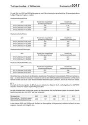 Thüringer Landtag - 5. Wahlperiode Drucksache 5/ 5017 Für die Zeit von 2005 bis 2006 sind wegen je nach Gerichtsbezirk unterschiedlicher Erhebungszeiträume lediglich folgende Angaben möglich: Staatsanwaltschaft Erfurt: Jahr Anzahl der eingeleiteten Anzahl der Ermittlungsverfahren Verfahrenseinstellungen 01.01.2005 bis 31.05.2005 182 k. A. 01.07.2005 bis 31.01.2006 319 177 01.02.2006 bis 31.12.2006 537 366 Staatsanwaltschaft Gera: Jahr Anzahl der eingeleiteten Anzahl der Ermittlungsverfahren Verfahrenseinstellungen 01.01.2005 bis 31.05.2005 310 163 01.07.2005 bis 31.12.2005 459 280 01.01.2006 bis 31.12.2006 921 627 Staatsanwaltschaft Meiningen: Jahr Anzahl der eingeleiteten Anzahl der Ermittlungsverfahren Verfahrenseinstellungen 01.01.2005 bis 31.12.2005 342 241 01.01.2006 bis 31.12.2006 523 367 Staatsanwaltschaft Mühlhausen: Jahr Anzahl der eingeleiteten Anzahl der Ermittlungsverfahren Verfahrenseinstellungen 01.12.2004 bis 13.02.2006 417 290 01.01.2006 bis 20.02.2007 274 190 Hinsichtlich der auf die Anzahl der Straftaten abstellenden Polizeilichen Kriminalstatistik (PKS) wird auf die An- lage 1 zu dieser Antwort verwiesen. Inwieweit es sich bei den Rohheitsdelikten/Gewaltdelikten um häusliche Gewalt handelt und ob die Opfer dieser Straftaten Behinderungen aufwiesen, wird in der PKS nicht erfasst. Zu 3.: Die nach der Anordnung über die Erhebung von statistischen Daten in Straf- und Bußgeldsachen (StP/OWi- Statistik) erhobenen Daten ergeben folgendes Bild: Bei den Amtsgerichten hat sich die Anzahl der Neuzugänge der Strafverfahren gegen die sexuelle Selbst- bestimmung seit dem Jahr 2007 wie folgt entwickelt: Amtsgerichte 2007 2008 2009 2010 2011 Neuzugänge - Verfahren gegen 208 157 130 141 160 die sexuelle Selbstbestimmung In den Jahren 2005 und 2006 wurde die Zahl der Neuzugänge nicht gesondert statistisch erfasst, so dass Angaben insoweit nicht möglich sind. 3