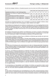 Drucksache 5/ 5017 Thüringer Landtag - 5. Wahlperiode Die Zahl der erledigten Verfahren in Gewaltschutzsachen hat sich seit dem Jahr 2005 wie folgt entwickelt: 2005 2006 2007 2008 2009 2010 2011 Gewaltschutzverfahren vor den Familiengerichten Maßnahmen zum Schutz vor Gewalt und Nachstellung (§ 1 208 174 226 243 381 636 746 GewSchG) Wohnungsüberlassung gemäß § 2 GewSchG 82 71 87 82 108 135 109 Gewaltschutzverfahren vor den Zivilgerichten - Amtsgericht 174 228 294 283 284 - - Gewaltschutzverfahren vor den Zivilgerichten - Landgericht 8 1 5 7 9 - - Gesamt 472 474 612 615 782 771 855 Hinsichtlich der Gewaltschutzverfahren wird in der Statistik nur die Zahl der erledigten Verfahren erfasst. Insoweit ist die Angabe der Zahl der Neuzugänge in diesen Verfahren nicht möglich. Seit Inkrafttreten des Gesetzes über das Verfahren in Familiensachen und in den Angelegenheiten der frei- willigen Gerichtsbarkeit (FamFG) zum 1. September 2009 liegt die Zuständigkeit für Gewaltschutzverfahren nur noch bei den Familiengerichten. Zuvor waren sowohl die Familien- als auch die Zivilgerichte für diese Verfahren zuständig. Aus diesem Grund sind auch nur für die Jahre 2005 bis 2009 entsprechende Zivilver- fahren aufgelistet. Die inhaltliche Unterscheidung der Verfahren nach Maßnahmen zum Schutz vor Gewalt und Nachstellung (§ 1 GewSchG) und Wohnungsüberlassung nach § 2 Gewaltschutzgesetz (GewSchG) ist nur für den Be- reich der Familiensachen möglich, da die statistische Erfassung nur hier gesondert erfolgt. Zu der Anzahl von Verfahren, in denen Frauen und Mädchen mit Behinderungen betroffen sind, gibt es kei- ne gesonderten statistischen Erhebungen. Die Anzahl der Abgeurteilten und Verurteilten in Thüringen wegen Straftaten nach dem Gewaltschutzgesetz sowie Straftaten gegen die sexuelle Selbstbestimmung nach der Strafverfolgungsstatistik ergibt sich aus der Anlage 2 zu dieser Antwort. Es werden weder Straftaten wegen sexualisierter/häuslicher Gewalt noch ent- sprechende Straftaten gegen Frauen und Mädchen noch gegen solche mit Behinderungen gesondert erfasst. Zu 4.: Seit 1995 sind auf Veranlassung des Justizministeriums bei allen vier Staatsanwaltschaften Sonderdezer- nate für Strafsachen gegen die sexuelle Selbstbestimmung und wegen häuslicher Gewalt eingerichtet. Die- se sollen eine Konzentration von Sachkompetenz und Erfahrungen sowie besondere Sensibilität im Um- gang mit dem Opfer gewährleisten. Für die Aus- und Fortbildung der Beamtinnen und Beamten der Polizei wurden spezielle Ausbildungspro- gramme entwickelt, um alle Polizeibeamt(inn)en in die Lage zu versetzen, bei Fällen häuslicher Gewalt ent- sprechend sensibilisiert auftreten und agieren zu können. Die Aus- und Fortbildung erfolgt unter Berücksich- tigung der 1995 erstellten Schulungskonzeption "Männliche Gewalt gegen Frauen" vom Bundesministerium für Familie, Senioren, Frauen und Jugend. Im Ausbildungsplan für den mittleren Polizeivollzugsdienst so- wie im Curriculum des gehobenen Polizeivollzugsdienstes wird diese Problematik thematisiert und ist da- mit fester Bestandteil der Ausbildung der Polizeibeamtinnen und -beamten. In der Integrierten Fortbildung der Thüringer Polizei wurde im ersten Grundseminar, welches seit 1995 unter der Federführung des Fort- bildungsinstitutes der Thüringer Polizei durchgeführt wird, das Thema "Häusliche Gewalt" für alle im Au- ßendienst tätigen Polizeivollzugsbeamtinnen und -beamten behandelt. Mit dieser Zielgruppe wurde und wird ein umfangreiches Training durchgeführt, so dass alle Teilnehmer entsprechend sensibilisiert auftre- ten und agieren können. Für die Bearbeitung von Sexualdelikten sowie Straftaten mit kindlichen und jugendlichen Opfern werden in den Kriminalpolizeiinspektionen besonders ausgebildete und geschulte Beamtinnen und Beamte einge- setzt. Zum Teil wurden speziell ausgestattete Vernehmungsräume eingerichtet. Zu 5.: An dem Institut für Rechtsmedizin des Universitätsklinikums Jena werden vereinzelt körperliche Untersu- chungen an Frauen, die Opfer häuslicher oder sexueller Gewalt wurden, auch ohne Anzeigeerstattung durch- geführt. Die Frauen erhalten ein für forensische Zwecke verwertbares Gutachten zu den Verletzungen und 4