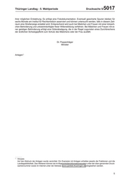 Thüringer Landtag - 5. Wahlperiode Drucksache 5/ 5017 ihrer möglichen Entstehung. Es erfolgt eine Fotodokumentation. Eventuell gesicherte Spuren bleiben für sechs Monate am Institut für Rechtsmedizin asserviert und können untersucht werden, falls in diesem Zeit- raum eine Strafanzeige erstattet wird. Entsprechend wird auch bei Mädchen und Frauen mit einer körperli- chen Behinderung und unbeeinträchtigter freier Willensbildung verfahren. Bei Mädchen und Frauen mit ei- ner geistigen Behinderung erfolgt eine Güterabwägung, die in der Regel zugunsten eines Durchbrechens der ärztlichen Schweigepflicht zum Schutz des Mädchens oder der Frau ausfällt. Dr. Poppenhäger Minister Anlagen *) *) Hinweis: Auf den Abdruck der Anlagen wurde verzichtet. Ein Exemplar mit Anlagen erhielten jeweils die Fraktionen und die Landtagsbibliothek. Des Weiteren können sie im Abgeordneteninformationssystem unter der oben genannten Druck- sachennummer sowie im Internet unter der Adresse: www.parldok.thueringen.de eingesehen werden. 5