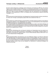 Drucksache 5/ 4502 Thüringer Landtag - 5. Wahlperiode (Stichwort: Familienbild) in Schule und Unterricht in Thüringen behandelt (Lehrplangestaltung, Gestal- tung von Schulbüchern, Qualifizierung von Lehrkräften usw.)? Wie wird diese Thematik in der Jugend- arbeit, Erwachsenenbildung und weiteren Bereichen berücksichtigt? 4. Inwieweit unterstützt der Freistaat Thüringen Organisationen und Aktivitäten der in den Fragen 1 bis 3 genannten Art finanziell bzw. logistisch (bitte für den Zeitraum von 2004 bis 2011 - soweit möglich auch für das Jahr 2012 - jeweils nach Jahresscheiben, geförderter Organisation bzw. Aktivitäten, Inhalt der Arbeit, die für die Zuwendung verantwortliche öffentliche Stelle und Fördersumme ausweisen)? 5. Inwiefern fand im Zeitraum von 2004 bis 2012 (1. Quartal) eine Evaluierung der geförderten Organisa- tionen (vgl. Frage 4) statt? Welche Kritik gab es nach Kenntnis der Landesregierung von Seiten der Or- ganisationen/Projekte, bezogen auf den o. g. Zeitraum? 6. Welchen Handlungsbedarf sieht die Landesregierung hinsichtlich der - insbesonderen finanziellen - Un- terstützung der o. g. (vgl. Frage 1 bis 4) Organisationen und Aktivitäten in Thüringen - auch mit Blick auf politische und rechtliche Vorgaben von Landes-, Bundes- und internationaler Ebene? Das Thüringer Ministerium für Soziales, Familie und Gesundheit hat die Kleine Anfrage namens der Landesregierung mit Schreiben vom 22. Mai 2012 wie folgt beantwortet: Vorbemerkung: Thüringen ist eines der wenigen Bundesländer, die in der Landesverfassung das Gleichstellungsgebot be- züglich der sexuellen Orientierung aufgenommen hat. Artikel 2 Abs. 3: "Niemand darf wegen …seines Ge- schlechtes oder seiner sexuellen Orientierung bevorzugt oder benachteiligt werden". Diese Vorgabe ist für Exekutive, Legislative und Judikative bindend. Statistische Angaben zur sexuellen Orientierung der Menschen im Freistaat Thüringen liegen nicht vor. Die tatsächliche Häufigkeit von homosexuellen Lebenserfahrungen hängt zu einem großen Teil von gesellschaft- lichen und kulturellen Rahmenbedingungen ab und kann daher nicht universell, sondern nur zeitgebunden und auf sozialen Schichten spezifiziert bestimmt werden. Die Vereinbarung über die Bildung einer Koalitionsregierung für die Fünfte Legislaturperiode des Thürin- ger Landtags setzt sich für die Stärkung der Rechte gleichgeschlechtlich orientierter Personen ein. Explizit genannt werden die bereits erfolgte Regelungen zum Lebenspartnerschaftsgesetz (Verpartnerung in Stan- desämtern, GVBl. 2010 S. 538) und zu den Versorgungsansprüche von Beamten und Beamtinnen (GVBl. 2011 S. 233). Die Landesregierung bekennt sich damit sich für die Belange von Bürgerinnen und Bürgern unterschiedlicher sexueller Orientierung und Identität einzusetzen. Gegenwärtig wird eine größere gesamtgesellschaftliche Diskussionsbereitschaft mit Bürgerinnen und Bür- ger mit lesbischer, schwuler, bisexueller, transgender und intersexueller Identität (LSBTI) als notwendig er- achtet. Die gleichberechtigte Teilhabe am Leben von Bürgerinnen und Bürgern mit lesbischer, schwuler, bisexueller, transgender und intersexueller Identität (LSBTI) ist gesamtgesellschaftliches Anliegen für alle Bürgerinnen und Bürger. Eine aktive demokratische und vorurteilsfreie Integration und Teilhabe ist das ver- bindende übergeordnete Ziel. Die Landesregierung vertritt weiterhin die Auffassung, Chancengleichheitspolitik jedwelcher Art sollte nicht für, sondern stets mit den betroffenen Personengruppen gestaltet werden. Daher hat die Landesregierung mit Beginn der 5. Legislaturperiode die kontinuierliche Diskussion mit Vertreterinnen/Vertretern der Men- schen mit sexueller Identität LSBTI gesucht und im Jahr 2011 einen entsprechenden Dialog im federführen- den Thüringer Ministerium für Soziales, Familie und Gesundheit begonnen. Die Diskussion orientiert sich dabei am Thesenpapier "Menschsein", das von einer AG Christopher Street Day im Jahr 2011 zur Bekannt- machung und Durchsetzung ihrer gesellschaftlichen Forderungen vorgelegt wurde (vgl. http://www.csd-wei- mar.de/index.php/csd-thueringen-2011/forderungen). Zu 1.: In der Landesregierung sind nur die Personen und Verbände/ Vereine bekannt, die um Gespräche oder um Förderung nachsuchen. Insofern kann nachfolgend als Verein lediglich der Lesben- und Schwulenverband Deutschlands (LSVD), Landesverband Thüringen e.V. benannt werden. Aktivitäten können der Internetsei- te entnommen werden. Url: http://thueringen.lsvd.de 2