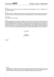 Thüringer Landtag 5. Wahlperiode Drucksache 5/ 3423 20.10.2011 Kleine Anfrage des Abgeordneten Kuschel (DIE LINKE) und Antwort des Thüringer Innenministeriums Kritik an der Kantinenversorgung an der Thüringer Fachhochschule für öffentliche Verwaltung, Fachbereich Polizei Die Kleine Anfrage 1774 vom 7. September 2011 hat folgenden Wortlaut: In der Ausgabe 9/2011 der Zeitschrift der GdP "Deutsche Polizei", Landesjournal Thüringen, wird durch Ver- treter der Jungen Gruppe der GdP erhebliche Kritik an der Kantinenversorgung an der Thüringer Fachhoch- schule für öffentliche Verwaltung, Fachbereich Polizei, in Meiningen geäußert. Die Kantine wird seit dem 1. Januar 2011 privat betrieben. Ich frage die Landesregierung: 1. In welcher Höhe haben sich die geplanten Kostenersparnisse in den ersten drei Quartalen 2011 gegen- über dem Vorjahr tatsächlich realisiert (bitte vergleichend nach Ausgabenhöhen darstellen)? 2. Wie viele Beschäftigte sind bei dem Betreiber der Verpflegungseinrichtung beschäftigt? Wie viele der Beschäftigten sind unbefristet eingestellt? Wie hoch ist die jeweilige Vergütung der Beschäftigten? Wie viele Beschäftigte sind vollzeit- bzw. teilzeitbeschäftigt? 3. Wie stellt sich die Beschäftigtensituation im Vergleich zum Vorjahr für den Bereich der Verpflegungsein- richtung dar? 4. Welche Kritiken an der Kantinenversorgung wurden durch Beschäftigte und Studierende an der Thü- ringer Fachhochschule für öffentliche Verwaltung, Fachbereich Polizei, im Einzelnen an die Leitung der Fachhochschule oder andere dienstvorgesetzte Stellen herangetragen? 5. Wie wurde seitens der Fachhochschule oder der dienstvorgesetzten Stellen auf diese Kritiken reagiert? 6. Durch welche konkreten Absprachen und Maßnahmen soll die Kritik hervorrufende Situation im Einzel- nen nachhaltig verbessert werden? Falls derzeit nichts Derartiges vorgesehen ist, warum nicht? 7. Unter welchen Voraussetzungen ist eine Rückverstaatlichung der Verpflegungseinrichtung möglich? Das Thüringer Innenministerium hat die Kleine Anfrage namens der Landesregierung mit Schreiben vom 19. Oktober 2011 wie folgt beantwortet: Zu 1.: Auf die Anlage 1 wird verwiesen. Druck: Thüringer Landtag, 27. Oktober 2011