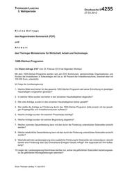 Thüringer Landtag 5. Wahlperiode Drucksache 5/ 4255 27.03.2012 Kleine Anfrage des Abgeordneten Kemmerich (FDP) und Antwort des Thüringer Ministeriums für Wirtschaft, Arbeit und Technologie 1000-Dächer-Programm Die Kleine Anfrage 2167 vom 23. Februar 2012 hat folgenden Wortlaut: Mit dem 1000-Dächer-Programm werden seit Juli 2010 Kommunen, gemeinnützige Organisationen und Kirchen bei Investitionen in Solaranlagen mit bis zu 40 Prozent der Investitionssumme, maximal aber mit 100 000 Euro, unterstützt. Ich frage die Landesregierung: 1. Welche Mittel sind bisher für das gesamte 1000-Dächer-Programm seit seiner Einrichtung im jeweiligen Haushaltsjahr vorgesehen gewesen? 2. In welcher Höhe wurden sie bisher in den einzelnen Haushaltsjahren abgerufen? 3. Wie viele Anträge wurden in den einzelnen Haushaltsjahren bisher gestellt? 4. Wer stellte die Anträge auf Förderung durch das 1000-Dächer-Programm (bitte einzeln mit der jeweili- gen Projektgröße und Investitionsvolumen auflisten)? 5. Welche Anträge wurden mit welchem Prozentsatz bewilligt? 6. Welche Anträge wurden mit welcher Begründung abgelehnt? 7. Welche nominale Gesamtleistung kann mit den durch die Förderung unterstützten Solarzellen erreicht werden? 8. Welche tatsächliche Gesamtleistung kann mit den durch die Förderung unterstützten Solarzellen erreicht werden? 9. Weshalb sieht die Landesregierung eine zusätzliche Förderung für Solarzellen als notwendig an, obwohl bereits eine Förderung über das Erneuerbare-Energien-Gesetz erfolgt? Wie begründet sie ihre Auffas- sung? 10.Liegen der Landesregierung Kenntnisse darüber vor, woher die geförderten Solarzellen beziehungswei- se die geförderten Montageleistungen stammen? Druck: Thüringer Landtag, 11. April 2012