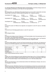 Drucksache 5/ 4255 Thüringer Landtag - 5. Wahlperiode Das Thüringer Ministerium für Wirtschaft, Arbeit und Technologie hat die Kleine Anfrage namens der Landesregierung mit Schreiben vom 26. März 2012 wie folgt beantwortet: Zu 1.: Die Förderrichtlinie zum 1000-Dächer-Photovoltaik-Programm ist seit Juli 2010 in Kraft. Dafür sind bisher folgende Mittel, einschließlich Verpflichtungsermächtigungen (VE), vorgesehen gewesen: Haushaltsjahr 2010 Ansatz VE 2011 VE 2012 VE 2013 2 Millionen Euro 1,5 Millionen Euro 1,5 Millionen Euro 1,5 Millionen Euro Haushaltsjahr 2011 Ansatz VE 2012 VE 2013 VE 2014 2,26 Millionen Euro 0,85 Millionen Euro 0,85 Millionen Euro 0,85 Millionen Euro Haushaltsjahr 2012 Ansatz VE 2013 VE 2014 VE 2015 1,69 Millionen Euro 0,29 Millionen Euro 0,13 Millionen Euro 0 Zu 2.: Im Jahr 2010 wurden 0,27 Millionen Euro abgerufen und ausgezahlt, im Jahr 2011 waren es 1,85 Millio- nen Euro. Zu 3.: Im Jahr 2010 sind 156 Anträge gestellt worden, im Jahr 2011 waren es 97. Zu 4.: Siehe anliegende Tabelle. Zu 5.: Es wurden sechs Anträge mit einem Fördersatz von 40 Prozent bewilligt, die die Voraussetzungen nach Zif- fer 5.4 Satz 2 f. der Förderrichtlinie erfüllt haben. Alle anderen Bewilligungen wurden mit einem Fördersatz von 20 Prozent (Ziffer 5.4 Satz 1 der Förderricht- linie) oder auch weniger ausgesprochen. Im Einzelnen siehe dazu anliegende Tabelle. Zu 6.: Es wurden Anträge abgelehnt, bei denen die Fördervoraussetzungen nicht erfüllt waren. Die folgende Auf- stellung nennt die Ablehnungsgründe und die Anzahl der auf die jeweiligen Gründe entfallenden Anträge. Ablehnungsjahr Ablehnungsgrund 2010 2011 2012 Gesamtergebnis Nicht förderfähig 2 1 10 13 Nicht förderwürdig 1 1 Vorbeginn 1 1 Gesamtergebnis 2 3 10 15 Quelle Thüringer Aufbaubank/Treasury/R. Großmann Zu 7.: Angaben über die Nominalleistung der jeweils geförderten Module liegen nicht vor. Es können lediglich An- gaben über die maximal installierte Leistung gemacht werden. So sind bisher Förderanträge für die Instal- lation von Photovoltaik-Anlagen mit einer Gesamtleistung von rund 7 900 kWp bewilligt worden. Zu 8.: Wie hoch der Stromertrag ist, den die Solarmodule während ihrer Betriebsdauer erbringen, wird vom Zu- wendungsgeber nicht erfasst. Zu 9.: Wesentliches Ziel des 1000-Dächer-Programms ist die Unterstützung von Kommunen, kommunalen Unter- nehmen, gemeinnützigen Organisationen, Vereinen, Energiegenossenschaften und Kirchen bei Investitio- nen in Photovoltaik-Anlagen. Diesen Einrichtungen fällt es aus finanziellen Gründen besonders schwer, in 2