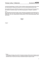 Thüringer Landtag - 5. Wahlperiode Drucksache 5/ 4255 erneuerbare Energieanlagen zu investieren. Solche Investitionen sind aber gerade deshalb wichtig, weil sie eine außerordentliche Vorbildwirkung ausstrahlen und eine hohe Öffentlichkeitswirksamkeit haben. Die Investitionsförderung des 1000-Dächer-Programms ist nicht mit der Zielsetzung des Erneuerbare-Ener- gien-Gesetzes, erneuerbare Energien in das Stromversorgungssystem zu integrieren, vergleichbar. Zu 10.: Die Landesregierung hat Kenntnis darüber, welche Unternehmen die geförderten Photovoltaikmodule her- gestellt haben, aber nicht woher die Module stammen. Die Montageleistungen stammen in der Regel von Unternehmen, die je nach vorgeschriebenem Auswahlverfahren von den Zuwendungsempfängern ausge- wählt werden. Machnig Minister Anlagen*) *) Hinweis: Auf den Abdruck der Anlagen wurde verzichtet. Ein Exemplar mit Anlagen erhielten jeweils die Fraktionen und die Landtagsbibliothek. Des Weiteren können sie im Landtagsinformationssystem unter der oben genannten Drucksa- chennummer sowie im Internet unter der Adresse: www.parldok.thueringen.de eingesehen werden. 3
