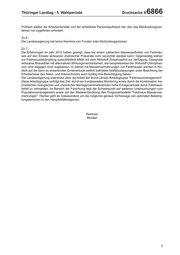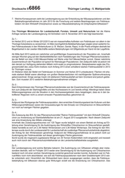 Thüringer Landtag 5. Wahlperiode Drucksache 5/ 6866 12.11.2013 Kleine Anfrage des Abgeordneten Dr. Augsten (BÜNDNIS 90/DIE GRÜNEN) und Antwort des Thüringer Ministeriums für Landwirtschaft, Forsten, Umwelt und Naturschutz Situation Feldmausbefall und -bekämpfung in Thüringen Die Kleine Anfrage 3409 vom 20. September 2013 hat folgenden Wortlaut: Das Bundesamt für Verbraucherschutz und Lebensmittelsicherheit hatte am 23. April 2013 die breitflächige Ausbringung von Ratron-Feldmausködern mit dem Wirkstoff Chlorphacinon zur Feldmausbekämpfung auf Ackerflächen des Freistaats Thüringen für einen Zeitraum von 120 Tagen genehmigt. Insbesondere die Um- weltverbände verweisen auf die beträchtliche Giftigkeit der Wirkstoffe Zinkphosphid und Chlorphacinon und auf die entsprechenden Gefahren, die mit der Ausbringung der Köder auf der Oberfläche verbunden sind. Inzwischen gibt es Informationen aus den Agrarunternehmen, dass es Ende Mai - ohne Bekämpfungsmaß- nahmen - zu einem Zusammenbruch der Feldmauspopulationen in den Problemgebieten gekommen sei. Außerdem scheint es eine ganze Reihe von flächenstarken Agrarbetrieben zu geben, die in den Problem- gebieten auf den Einsatz von Chlorphacinon verzichtet und stattdessen die Mäusebekämpfung mit Zink- phosphid-Giftweizen durchgeführt haben, der mittels Legeflinten verteilt wurde. Ich frage die Landesregierung: 1. Wie haben sich in den Problemgebieten die Feldmauspopulationen vom Beginn der Vegetationsperiode bis jetzt entwickelt? 2. Welche Auswirkungen hatten die Starkregenereignisse bzw. das Hochwasser im Juni sowie die Trocken- zeiten im Sommer auf die Feldmauspopulationen in den Problemgebieten? 3. Welche Konsequenzen ergeben sich aus den Antworten zu den Fragen 1 und 2 für die am 23. April 2013 vom Bundesamt für Verbraucherschutz und Lebensmittelsicherheit (BVL) genehmigte Ausbringung des Wirkstoffs Chlorphacinon im Streuverfahren in einem Zeitraum von 120 Tagen? 4. Wie ist der Stand bei Beantragung, Genehmigung und Vollzug des Einsatzes von Chlorphacinon in Thü- ringen nach der Genehmigung durch das BVL vom 23. April 2013? Wie viel von der genehmigten Menge Chlorphacinon wurde eingesetzt, was geschah gegebenenfalls mit der Restmenge? 5. Sind der Landesregierung Betriebe bekannt, die in den Problemgebieten auf den Einsatz von Chlorphaci- non verzichtet und stattdessen die Mäusebekämpfung mit Zinkphosphid-Giftweizen durchgeführt haben, der mittels Legeflinten verteilt wurde? Wenn ja, wie wird die Wirksamkeit dieser Maßnahme eingeschätzt? 6. Hat die Landesregierung Kenntnis von Funden toter Tiere (Nichtzielorganismen), die auf Rückstände von Chlorphacinon und Zinkphosphid untersucht wurden? Wenn ja, mit welchen Ergebnissen? Druck: Thüringer Landtag, 3. Dezember 2013