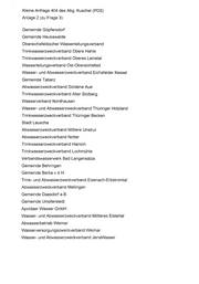 Kleine Anfrage 404 des Abg. Kuschel (PDS) Anlage 2 (zu Frage 3) Gemeinde Göpfersdorf Gemeinde Heukewalde Obereichsfeldischer Wasserleitungsverband Trinkwasserzweckverband Obere Hahle Trinkwasserzweckverband Oberes Leinetal Wasserleitungsverband Ost-Obereichsfeld Wasser- und Abwasserzweckverband Eichsfelder Kessel Gemeinde Tabarz | Abwasserzweckverband Goldene Aue Trinkwasserzweckverband Alter Stolberg Wasserverband Nordhausen Wasser- und Abwasserzweckverband Thüringer Holzland Trinkwasserzweckverband Thüringer Becken Stadt Lauscha Abwasserzweckverband Mittlere Unstrut Abwasserzweckverband Notter Trinkwasserzweckverband Hainich Trinkwasserzweckverband Lochmühle Verbandswasserwerk Bad Langensalza Gemeinde Behringen Gemeinde Berka v.d.H. Trink- und Abwasserzweckverband Eisenach-Erbstromtal Abwasserzweckverband Mellingen Gemeinde Daasdorf a.B. Gemeinde Umpferstedt Apoldaer Wasser GmbH Wasser- und Abwasserzweckverband Mittleres Elstertal Abwasserbetrieb Weimar Wasserversorgungszweckverband Weimar Wasser- und Abwasserzweckverband JenaWasser