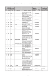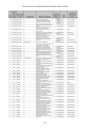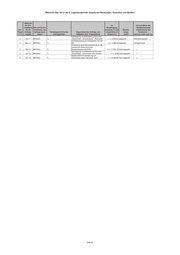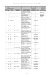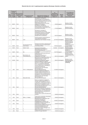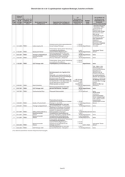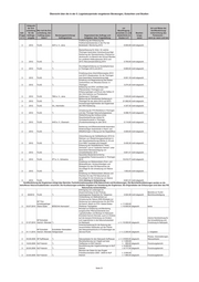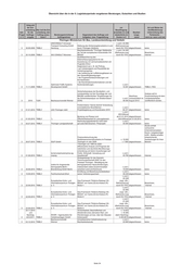 Übersicht über die in der 5. Legislaturperiode vergebenen Beratungen, Gutachten und Studien Zeitpunkt der Ent- vor Art und Weise der scheidung Wer traf die Ent- Beauftragung Veröffentlichung/ betr. für die scheidung, den erwartete (v) und Bearbei- Unterrichtung des Frage Auftrags- Auftrag auszu- Beratungseinrichtung/ Gegenstand des Auftrags und tatsächliche (t) tungs- Parlaments – 2/3 vergabe lösen? Auftragnehmer Aufgaben- bzw. Fragestellung Kosten in € stand wenn ja: wann und wie Erbringung von Leistungen im Zusammenhang mit der Erstellung von Hochwasserabfluss-Längsschnitten für die Gramme, Scherkonde und Lossa sowie eine Bewertung des Gefahren- bzw. Gefährdungspotentials der Stauanlagen Berichte an TLUG/ 3 05/2011 TLUG *) Hopfgarten und Vieselbach 3.618,00 abgeschl. Berichtsverteidigung Erbringung von Leistungen im Zusammenhang mit der Erstellung von Hochwasserabfluss-Längsschnitten für die Berichte an TLUG/ 3 05/2011 TLUG *) Leina-Hörsel und die Nesse 2.713,00 abgeschl. Berichtsverteidigung Erbringung von Leistungen im Zusammenhang mit der Prüfung hydrologischer Gutachten für Stauanlagen und die Erstellung gewässerkundlicher Grundlagen (HQ(T)-Längsschnitte: Berichte an TLUG/ 3 05/2011 TLUG *) Königseer Rinne und Schwarza) 6.421,24 abgeschl. Berichtsverteidigung Ermittlung geogener Hintergrundwerte für nichtsynthetische Schadstoffe in Berichte an TLUG 3 08/2011 TLUG C&E Fließgewässern des Freistaates Thüringen 22.776,79 nicht abgeschl. /Berichtsverteidigung Berichte an TLUG/ Berichtsverteidigung/ Arbeitsgrundlage für Erarbeitung einer Studie zur Bewertung des Beiträge zum Grundwasserforschungs- zukünftigen Umgangs mit Haldenwässern Maßnahmenprogramm 3 10/2011 TLUG institut Dresden im Kali-Südharz-Revier 19.942,02 abgeschl. i.S. § 32 ThürWG Berichte an TLUG/ 3 10/2011 TLUG WISMUT GmbH Sondermessnetz Braunkohle 58.458,93 nicht abgeschl. Berichtsverteidigung Überarbeitung des Arbeitspapiers Arbeitsgrundlage für "Struktur/Morphologie sowie Beiträge zum Durchgängigkeit an Schwerpunktgewässern Maßnahmenprogramm 3 10/2011 TLUG IPU in Thüringen 10.277,49 abgeschl. i.S. § 32 ThürWG Erstellung einer Handlungsempfehlung für Berichte an TLUG/ die Bewertung von Berichtsverteidigung/ Büro für Grün- und Kompensationsmaßnahmen an Veröffentlichung in 2012 3 10/2011 TLUG Landschaftsplanung Fließgewässern und in Auen 8.921,43 nicht abgeschl. geplant Berechnung von ausgewählten Zufluss- und Abgabekennwerten und -ganglinien für Wiederkehrintervalle T für das Berichte an TLUG/ 3 01/2012 TLUG *) Hochwasserrückhaltebecken Watzdorf 2.844,10 nicht abgeschl. Berichtsverteidigung Erfassung wertgebender Vogelarten siehe Ende der 2012/2013 im Thüringer Vogelschutzgebiet Aufstellung SPA Nr. 44 "Nordöstliches Altenburger Land", die Bewertung von Artvorkommen sowie die Abgrenzung von Habitatflächen und die Dokumentation des Gebietszustandes unter besonderer Berücksichtigung von 3 2012 TLUG VTO e. V., Hildburghausen Störungen/Beeinträchtigungen 21.200,00 nicht abgeschl. Erfassung wertgebender Vogelarten im Thüringer Vogelschutzgebiet SPA Nr. 02 "Südharzer Gipskarst", die Bewertung von Artvorkommen sowie die Abgrenzung von Habitatflächen und die Dokumentation des Gebietszustandes unter besonderer Berücksichtigung von 3 2012 TLUG Ökotop GbR, Halle Störungen/Beeinträchtigungen 15.051,12 nicht abgeschl. Erfassung wertgebender Vogelarten im Thüringer Vogelschutzgebiet SPA Nr. 37 "Frankenwald - Schieferbrüche Lehesten", die Bewertung von Artvorkommen sowie die Abgrenzung von Habitatflächen und die Dokumentation des Gebietszustandes unter besonderer Berücksichtigung von 3 2012 TLUG *) Störungen/Beeinträchtigungen 22.473,15 nicht abgeschl. Kartierung von Mollusken in den Bereichen Benneckenstein, Hasselfelde, Blankenhayn, Tambach-Dietharz und Teichwolframsdorf. Datenaufarbeitung und -bereitstellung von Molluskendaten für das Fachinformations¬system (FIS) Naturschutz 3 2012 TLUG *) (LINFOS). 3.000,00 nicht abgeschl. Fortführung der landesweiten Wanderfalken- 3 2012 TLUG AWS e. V., Freiberg Bestandsüberwachung 2012 3.000,00 nicht abgeschl. Basiserfassung zur Libellenfauna in den Landkreisen Sonneberg und 3 2012 TLUG *) Hildburghausen (2012/2013) 16.036,21 nicht abgeschl. Schlagopfersuche zur Brutzeit in drei ausgewählten Windparks Thüringens und 3 2012 TLUG *) die Ermittlung von Abtragraten 4.000,00 nicht abgeschl. Untersuchung der aktuellen Vorkommen der hochmontanen Bergbacharten in den Quellbereichen/Bergbachbereichen verschiedener Flüsse in Thüringen in den 3 2012 TLUG *) Jahren 2012 und 2013 6.283,20 nicht abgeschl. Erfassung des Schwarzstorchbestandes im 3 2012 TLUG *) westlichen Thüringer Wald 2012 1.000,00 nicht abgeschl. Seite 30