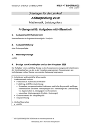 Ministerium für Schule und Bildung NRW M LK HT B2 GTR (GG) Seite 1 von 7 Unterlagen für die Lehrkraft Abiturprüfung 2019 Mathematik, Leistungskurs Prüfungsteil B: Aufgaben mit Hilfsmitteln 1. Aufgabenart / Inhaltsbereich Innermathematische Argumentationsaufgabe / Analysis 2. 1 Aufgabenstellung siehe Prüfungsaufgabe 3. Materialgrundlage entfällt 4. Bezüge zum Kernlehrplan und zu den Vorgaben 2019 Die Aufgaben weisen vielfältige Bezüge zu den Kompetenzerwartungen und Inhaltsfeldern des Kernlehrplans bzw. zu den in den Vorgaben ausgewiesenen Fokussierungen auf. Im Folgenden wird auf Bezüge von zentraler Bedeutung hingewiesen. 1. Inhaltsfelder und inhaltliche Schwerpunkte Funktionen und Analysis • Funktionen als mathematische Modelle • Fortführung der Differentialrechnung – Behandlung von ganzrationalen Funktionen, natürlicher Exponential- und Loga- rithmusfunktion und deren Verknüpfungen bzw. Verkettungen mit Untersuchung von Eigenschaften in Abhängigkeit von Parametern – notwendige Ableitungsregeln (Produkt-, Kettenregel) • Grundverständnis des Integralbegriffs • Integralrechnung 2. Medien/Materialien • entfällt 1 Die Aufgabenstellung deckt inhaltlich alle drei Anforderungsbereiche ab. Abiturprüfung 2019 – Nur für den Dienstgebrauch!