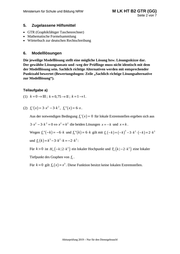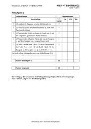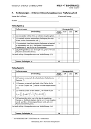 M LK HT B2 GTR (GG) Ministerium für Schule und Bildung NRW Seite 6 von 7 7. Teilleistungen – Kriterien / Bewertungsbogen zur Prüfungsarbeit Name des Prüflings:__________________________________ Kursbezeichnung:_________ Schule: _____________________________________________ Teilaufgabe a) Anforderungen Lösungsqualität 2 maximal EK ZK erreichbare Der Prüfling DK Punktzahl 1 2 (1) entscheidet, welcher Wert zu welchem Graphen gehört. (2) ermittelt mit einer notwendigen Bedingung die mög- lichen lokalen Extremstellen von fk . 3 4 3 (2) ermittelt mit einer hinreichenden Bedingung rechnerisch in Abhängigkeit von k > 0 die lokalen Extrempunkte des Graphen von fk und die Art der Extrempunkte. 5 (2) gibt begründet an, dass der Graph von fk für k = 0 keine lokalen Extremstellen besitzt. Sachlich richtige Lösungsalternative zur Modelllösung: (13) …………………………………………………………………… …………………………………………………………………… 1 4 Summe Teilaufgabe a) 13 Teilaufgabe b) Anforderungen Lösungsqualität maximal EK ZK erreichbare Der Prüfling Punktzahl 1 (1) bestimmt rechnerisch die erforderlichen Nullstellen der Funktion f1 . 2 2 (1) bestimmt rechnerisch den Inhalt A der Fläche, die für x ≤ 0 vom Graphen von f1 und der x-Achse eingeschlossen wird. 5 3 (2) weist nach, dass für den Inhalt I a der Fläche F gilt: 4 4 2 3+a 1 Ia = − ⋅ − a + 3 − ⋅ − a+3 . 2 4 4 (3) bestimmt den Wert von a, für den die zugehörige Gerade ga die Fläche halbiert, die für x ≤ 0 vom Graphen von f1 und der x-Achse eingeschlossen wird, auf zwei Nachkommastellen genau. Sachlich richtige Lösungsalternative zur Modelllösung: (14) …………………………………………………………………… …………………………………………………………………… Summe Teilaufgabe b) ( 2 ) ( ) 3 14 EK = Erstkorrektur; ZK = Zweitkorrektur; DK = Drittkorrektur Abiturprüfung 2019 – Nur für den Dienstgebrauch! DK