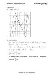 M LK HT B2 GTR (GG) Ministerium für Schule und Bildung NRW Seite 4 von 7 Teilaufgabe c) (1) t1 : y = − 2,25 ⋅ x + 0,25 . I II x III (2) Differenzfunktion: 2 3 2 3 ( ) dk x = t k ( x ) − fk ( x ) = ( 0,75 − 3 ⋅ k ) ⋅ x + 0,25 − ( x − 3 ⋅ k ⋅ x ) = − x + 0,75 ⋅ x + 0,25 . Damit hängt dk nicht vom Parameter k ab. Stellen, an denen die Tangente t k und der Graph von fk gemeinsame Punkte besitzen: GTR dk ( x ) = 0 [⇔ − x + 0,75 ⋅ x + 0,25 = 0] ⇔ x = − 0,5 ∨ x = 1 . 3 1 27 ( ) d x x = ≈ d 0, 42 . k 64 − 0,5 GTR Der Inhalt der Fläche, die von der Tangente t k und dem Graphen von fk eingeschlossen 27 wird, beträgt FE. 64 Abiturprüfung 2019 – Nur für den Dienstgebrauch!