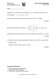 M LK HT B3 GTR (GG) Seite 3 von 3 Name: _______________________ Spiegelt man T an der Ebene mit der Gleichung x1 = 2,5 , so erhält man die Ebene T ' mit der Gleichung T ' : −5 ⋅ x1 + 4 ⋅ x2 + 5 x3 − 5 = 0 . g) Berechnen Sie die Größe des Winkels, unter dem sich T und T ' schneiden. (3 Punkte) 0 2,5 Betrachtet wird die Schar der Geraden ga : x = 0 + r ⋅ −10a mit a > 0 und r ∈ IR . 3,5 2 a h) Begründen Sie, dass keine Gerade der Schar in der Ebene mit der Gleichung x3 = 3,5 liegt. (2 Punkte) i) Bestimmen Sie eine Parametergleichung der Geraden g, die zur Schar ga gehört und in der Ebene T liegt. Zeigen Sie, dass die Gerade g auch in T ' liegt. (6 Punkte) Zugelassene Hilfsmittel: • GTR (Graphikfähiger Taschenrechner) • Mathematische Formelsammlung • Wörterbuch zur deutschen Rechtschreibung Abiturprüfung 2019 – Nur für den Dienstgebrauch!