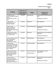 Anlage 4 beklagte Umstufungsverfahren Seite 1 Zeitpunkt der Vorgang ursprünglichen Kläger Ergebnis des Wirksamkeit Verfahrens K 113/302 zur G-Str. 01.01.05 Gemeinde Grub Klagerücknahme durch die Gemeinde vom OT Tachbach der Stadt Grub Themar bis zur L 2633 in der Gem. Einstellung des Verfahrens Grub L 1091 zur G-Str. 01.01.05 Stadt Gefell Klage abgewiesen von B 90 bis B 2 im OT Göttengrün (Gefell) L 2693 zur G-Str. 01.01.05 Gemeinde Masserberg Klagerücknahme durch die Gemeinde vom OT Schnett (Gem. Masserberg Masserberg) über OT Heubach (Gem. Masserberg) Einstellung des Verfahrens bis L 2052 L 1355 zur G-Str. von der 01.01.05 Stadt Lucka Klagerücknahme durch die Gemeinde Landesgrenze Sachsen bis Masserberg zur L 1350 in Lucka Einstellung des Verfahrens L 2157 zur G-Str. von B 176 01.01.06 Stadt Rastenberg Klage abgewiesen östl. OT Rothenberga (Rastenberg) bis derzeit läuft das Berufungsverfahren Landesgrenze Sa.-Anhalt L 2040 zur G-Str. 01.01.07 Gemeinde Unstruttal Klage abgewiesen von der Einmündg der südl. "Hauptstraße" im OT Reiser bis zum Abzw. der L 2041 im OT Kaisers-hagen der Gem. Unstruttal L 2359 zur K 501 und zur 01.01.07 Gemeinde Oberoppurg das Verfahren ist noch nicht G-Str. von der K 501 (östl. abgeschlossen Einmündung) in der Gem. Gemeinde Oppurg Ober-oppurg bis B 281 in Gem. Oppurg L 2014 zur G-Str. 01.01.07 Gemeinde Teistungen Klagerücknahme durch die Gemeinde von der L 2013 in der OL Masserberg Neuendorf (Teistungen) bis zur L 2015 in der OL Einstellung des Verfahrens Böseckendorf (Teistungen)