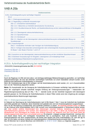 Verfahrenshinweise der Ausländerbehörde Berlin aus Altersgründen das Erfordernis der Lebensunterhaltssicherung sowie das Sprachnachweiserfordernis nicht erfüllen können. Das Erfordernis, sich im Übrigen in die hiesigen Verhältnisse nachhaltig integriert zu haben, gilt aber auch für diesen Personenkreis. Die Gründe Krankheit bzw. Behinderung müssen regelmäßig durch ärztliche Atteste belegt werden, die den Schluss nahelegen, dass von den Betroffenen das Sprachnachweiserfordernis bzw. das Erfordernis der Lebensunterhaltssicherung nicht zu verlangen ist. Auf einen Nachweis kann nur dann verzichtet werden, wenn die Ausschlussgründe offenkundig sind. Nicht jede Krankheit oder Behinderung führt zum Ausschluss dieser Voraussetzungen, sondern nur diejenigen, die den Ausländer an der Erlangung der Kenntnisse hindern. Beispielhaft sei die Unfähigkeit des Ausländers genannt, sich mündlich oder schriftlich zu artikulieren oder angeborene Formen geistiger Behinderung oder altersbedingte Beeinträchtigungen. Für das Absehen bei Behinderung, Krankheit gelten die allgemeinen zu § 9 Abs. 2 Satz 3 entwickelten Kriterien. Ein Absehen aus Altersgründen von den vorgenannten Voraussetzungen ist jedenfalls ab dem 65. Lebensjahr sowie bei allen noch nicht schulpflichtigen Kindern, d.h. Kindern vor Vollendung des 6. Lebensjahres (§ 8 SchulGBln) anzunehmen. Soll davon abweichend aus Altersgründen von den Voraussetzungen abgesehen werden, ist konkret zu belegen, dass aus Altergründen der Spracherwerb und die überwiegende Lebensunterhaltssicherung nicht erfüllt werden können. Die übrigen Voraussetzungen bleiben von dieser Ausnahmeregelung unberührt. 25b.4. Erleichterte Voraussetzungen für Ehegatten, Lebenspartner und minderjährige Kinder Absatz 4 regelt die Möglichkeit für Ehegatten, eingetragene Lebenspartner und minderjährige ledige Kinder, die mit einem Begünstigten nach Absatz 1 in familiärer Lebensgemeinschaft leben, abweichend von der erforderlichen Aufenthaltsdauer in § 25b Abs. 1 Satz 2 Nr. 1 eine Aufenthaltserlaubnis zu erhalten. Bzgl. der entsprechenden Anwendung des Abs. 1 S. 2 Nr. 2 – 5 gelten keine Besonderheiten. Der Lebensunterhalt der in Absatz 4 bezeichneten Familienangehörigen ist auch gesichert bzw. überwiegend gesichert im Sinne von Absatz 1 Satz 2 Nummer 3, wenn nur ein Mitglied der Bedarfsgemeinschaft ein entsprechendes Einkommen aus Erwerbstätigkeit erzielt, welches den Lebensunterhalt der gesamten Bedarfsgemeinschaft überwiegend sichert. § 31 gilt für Ehegatten und Lebenspartner entsprechend. Erteilungsgrundlage bleibt aber § 25b Abs. 4. Der Familiennachzug ist gem. § 29 Abs. 3 S. 3 ausgeschlossen. 25b.5. Aufenthaltsdauer/Nebenbestimmung/Sperrwirkung Die Aufenthaltserlaubnis wird regelmäßig für 2 Jahre ausgestellt und mit der Nebenbestimmung „Erwerbstä-tigkeit gestattet“ versehen. Werden öffentliche Leistungen bezogen, ist die Aufenthaltserlaubnis mit einer Wohnsitzauflage zu versehen, vgl. A. 12.2.2. Ausländer, die bei der Ersterteilung noch keine ausreichenden schriftlichen und mündlichen Sprachkenntnisse der Stufe B1 aufweisen, sind gemäß § 44a Abs. 1 Nr. 3 zum Integrationskurs zu verpflichten. Die Aufenthaltserlaubnis kann abweichend von § 10 Absatz 3 Satz 2 erteilt werden, so dass eine Aufenthaltserlaubnis nach § 25b auch in Betracht kommt, wenn zuvor ein Asylantrag nach § 30 Absatz 3 des Asylverfahrensgesetzes als offensichtlich unbegründet abgelehnt wurde. Hinsichtlich der Erteilung einer Niederlassungserlaubnis findet § 26 Abs. 4 Anwendung. Die Erteilung einer Erlaubnis zum Daueraufenthalt-EU ist nach § 9a Abs. 3 Nr. 1 ausgeschlossen. Die Sperrwirkung nach § 11 hindert grundsätzlich die Erteilung der Aufenthaltserlaubnis, allerdings ist in diesen Fällen zu prüfen, ob eine Aufhebung der Einreise- und Aufenthaltsverbots gemäß § 11 Abs. 4 Satz 2 in Betracht kommt, weil die Erteilungsvoraussetzungen nach § 25b erfüllt sind, vgl. A.11.4. Ausländern, deren Antrag auf Erteilung bzw. Verlängerung der Aufenthaltserlaubnis nach § 104a Abs. 3 S. 1 abgelehnt wurde, weil ein in häuslicher Gemeinschaft lebendes Familienmitglied Straftaten begangen hat, können bei Vorliegen der Voraussetzung Aufenthaltstitel nach § 25b erteilt werden. E-Mail an die VAB-Redaktion Dieses PDF wurde erstellt am: 05.12.2016 Seite 221 von 747