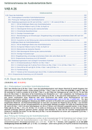 Verfahrenshinweise der Ausländerbehörde Berlin VAB A 26 Inhaltsverzeichnis A.26. Dauer des Aufenthalts ..................................................................................................................................................... 222 26.1. Erteilungsdauer humanitärer Aufenthaltserlaubnisse ............................................................................................... 222 26.2. Prüfung der Verlängerung der Aufenthaltserlaubnis ................................................................................................. 222 26.3. Niederlassungserlaubnis bei AE nach § 25 Abs. 1 und 2 S. 1 1.Alt. sowie § 23 Abs. 4 ........................................... 223 26.3.1.1. NE bei fünfjährigem Besitz einer Aufenthaltserlaubnis ................................................................................ 224 26.3.1.2. Es liegt kein Widerruf nach § 73 Abs. 2a AsylG vor .................................................................................... 224 26.3.1.3. Überwiegende Sicherung des Lebensunterhaltes ....................................................................................... 224 26.3.1.4. Hinreichende Sprachkenntnisse .................................................................................................................. 224 26.3.1.5. Sonstige Voraussetzungen .......................................................................................................................... 225 26.3.2.1. Berücksichtigung von Erkrankungen, Ehegattenprivileg und sonstige anrechenbare Zeiten (NE nach fünf Jahren Besitz der AE) ................................................................................................................................................. 225 26.3.2.2. Ausnahme von der Sicherung des Lebensunterhaltes bei Erreichen der Regelaltersgrenze (nur bei fünfjährigem Besitz der Aufenthaltserlaubnis) ............................................................................................................ 225 26.3.3.1. NE bei dreijährigem Besitz einer Aufenthaltserlaubnis ................................................................................ 225 26.3.3.2. Es liegt kein Widerruf nach § 73 Abs. 2a AsylG vor .................................................................................... 226 26.3.3.3. Beherrschen der deutschen Sprache .......................................................................................................... 226 26.3.3.4. Weit überwiegende Sicherung des Lebensunterhaltes ................................................................................ 226 26.3.3.5. Sonstige Voraussetzungen .......................................................................................................................... 226 26.3.4. Ehegattenprivileg und sonstige anrechenbare Zeiten (drei Jahre Besitz der AE) .......................................... 227 26.3.5. Entsprechende Anwendung von § 35 AufenthG ............................................................................................. 227 26.4. Niederlassungserlaubnis nach sonstigem humanitärem Aufenthalt ......................................................................... 227 26.4.1.3. Ermessensausübung im Rahmen von Abs. 4 Satz 1 ................................................................................... 227 26.4.1.4. Unterbrechungen der 5-Jahres-Frist im Sinne von Abs. 4 Satz 1 i.V.m. § 9 Abs. 2 Satz 1 Nr. 1 ................ 228 26.4.1.5. Keine NE bei AE nach §§ 24, 25 Abs. 4 Satz 1 oder § 25 Abs. 4 a ............................................................. 228 26.4.1.6. Familiennachzug .......................................................................................................................................... 228 26.4.1.7. Verweis auf die Voraussetzungen des § 9 Abs. 2 (Lebensunterhaltssicherung) ......................................... 228 26.4.4. Entsprechende Anwendung von § 35 AufenthG .................................................................................................... 229 A.26. Dauer des Aufenthalts ( 20.09.2016; IntG; 18.10.2016 ) 26.1. Erteilungsdauer humanitärer Aufenthaltserlaubnisse Gem. dem Wortlaut des § 26 Abs.1 Satz 1 kann die Aufenthaltserlaubnis nach diesem Abschnitt für jeweils längstens drei Jahre erteilt und verlängert werden. Zudem besagt § 26 Abs. 1 Satz 2, dass in den Fällen des § 25 Abs. 1 und 2 1. Alt. die AE erstmalig für 3 Jahre zu erteilen ist (§ 26 Abs. 1 Satz 2; zu den Fällen der Verlängerung vgl. unten 26.3.2). Für die Fälle des § 25 Abs.2.Satz1 2. Alternative ist bei Ersterteilung eine Mindestfrist von 1 Jahr vorgesehen; bei Verlängerung eine Mindestfrist von 2 Jahren. Diese Fristen orientieren sich dabei an § 26 Abs. 3, der nach einer Geltungsdauer von frühestens drei Jahren vorbehaltlich eines Widerrufs oder einer Rücknahme des BAMF einen Rechtsanspruch auf eine Niederlassungserlaubnis gewährt, sofern die besonderen Voraussetzungen nach § 26 Abs. 3 erfüllt sind . Vor dem Hintergrund der erheblich gestiegenen Belastung des BAMF und damit im Einzelfall nicht auszuschließenden hier verspätet eingehenden Widerrufs- und Rücknahmemitteilungen ist nach Sinn und Zweck der Regelung des § 26 Abs. 1 aus Gründen der Kundenorientierung und der Verwaltungseffizienz ein großzügiger Maßstab anzulegen und sollte die Ersterteilung einer AE nach § 25 Abs. 1 und 2 mit einer Geltungsdauer von bis zu 3 Jahren und 6 Monaten ausgestellt werden. In den übrigen Fällen (§§ 22, 23 Abs. 1, 23 a, 24, 25 Abs. 4 S. 2) sollte zur Entlastung der Ausländerbehörde von der Drei-Jahres-Frist ebenfalls großzügig Gebrauch gemacht werden, solange nicht absehbar ist, dass das der Ausreise entgegenstehende Hindernis in nächster Zeit endet. Für die Fälle des § 25 Abs. 3 ist eine Mindestfrist von einem Jahr vorgesehen (§ 26 Abs. 1 Sat z 4). Vgl. auch A.7.2.1.2. 26.2. Prüfung der Verlängerung der Aufenthalts