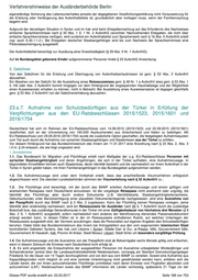 Verfahrenshinweise der Ausländerbehörde Berlin Einreise der Flüchtlinge. Ausgenommen sind unbegleitete Minderjährige und Schwerstkranke. 1.6. Personen, die schwerstkrank oder minderjährig sind und ohne Familienangehörige aufgenommen werden, werden zwar in die Verteilung einbezogen; in solchen Fällen klärt das BAMF vor der Einreise unter Berücksichtigung der jew. Anzahl bereits erfolgter Aufnahmen, welches Land zur Aufnahme einer schwerstkranken Person und ihrer Familienangehörigen bzw. eines unbegleiteten Minderjährigen bereit ist. Die Personen werden von einem Vertreter des aufnehmenden Landes unmittelbar nach Ankunft vom Zielflughafen zum Zielort begleitet. Bei Minderjährigen, die ohne Familienangehörige aufgenommen werden, gewährleistet das aufnehmende Land, dass diese am Zielflughafen in Empfang genommen und dem für die Inobhutnahme zuständigen Jugendamt zugeführt werden. 1.7. Die Verteilung der ausgewählten Personen erfolgt nach Maßgabe des Königsteiner Schlüssels (Berlin 5,08 % für 2016) und unter Berücksichtigung der Wahrung der Familieneinheit und sonstiger integrationsförderlicher Bindungen nach Deutschland. Für die Verteilung finden § 24 Abs. 3 und 4 entsprechende Anwendung, bzgl. der Wohnsitzregelung gilt bis zum 05.08.2019 § 12a; danach finden § 24 Abs. 4 und 5 Anwendung (s. dazu auch nachfolgend 2.). 2. Begünstigter Personenkreis Die Auswahl der Flüchtlinge durch das BAMF orientiert sich an folgenden Kriterien: Wahrung der Familieneinheit Familiäre oder sonstige integrationsförderliche Bindungen nach Deutschland, Integrationsfähigkeit (Indikatoren: Grad der Schul- und berufsausbildung, Berufserfahrung, Sprachkenntnisse, Religionszugehörigkeit, geringes Alter), Grad der Schutzbedürftigkeit, ggf. weitere Kriterien, die im Rahmen von gemeinsamen Verfahrensleitlinien auf EU-Ebene mit der Türkei vereinbart werden. 3. Ausschlussgründe die wegen Delikten, die in Deutschland als vorsätzliche Straftat anzusehen sind, verurteilt worden sind oder bei denen tatsächliche Anhaltspunkte die Schlussfolgerung rechtfertigen, dass Verbindungen zu kriminellen organisationen oder terroristischen Vereinigungen bestehen oder bestanden haben oder dass sie in sonstiger Weise Bestrebungen verfolgen oder unterstützen oder unterstützt haben, die gegen den Gedanken der Völkerverständigung verstoßen oder gegen das friedliche Zusammenleben der Völker gerichtet sind. 4. Erteilung und Verlängerung des Aufenthaltstitels im Inland 4.1. Im Rahmen des Aufnahmeverfahrens findet eine Überprüfung der Personen im Visumverfahren durch die Sicherheitsbehörden statt. Eine Beteiligung der Sicherheitsbehörden im Inland ist damit erst vor der Verlängerung der Aufenthaltserlaubnis erforderlich. 4.2. Die aufgenommenen Flüchtlinge erhalten eine AE nach § 23 Abs. 2 für drei Jahre; von der Anwendung der allgemeinen Erteilungsvoraussetzungen des § 5 Abs. 1 ist dabei abzusehen. Der Aufenthaltstitel berechtigt zur Ausübung einer Erwerbstätigkeit (§ 23 Abs. 2 S. 5). Die Aufenthaltserlaubnis wird bei der Ersterteilung für die Dauer ihrer dreijährigen Gültigkeit mit der Auflage „Wohnsitznahme im Land Berlin erforderlich" versehen (bzgl. der Einzelheiten vgl. die Ausführungen unter A.12a.). Besteht ein Anspruch auf einen Integrationskurs (§ 44 Abs. 1 S. 1 Nr. 2 i.V.m. Abs. 3) und verfügt die Person nicht über ausreichende Kenntnisse der deutschen Sprache, ist eine Verpflichtung zur Teilnahme an einem Integrationskurs zu verfügen (§ 44 Abs. 1 S. 1 Nr. 1 b). 4.3. Auf die Verlängerung der AE finden dieselben Vorschriften Anwendung wie auf die Erteilung (§ 8 Abs. 1). Daraus folgt, dass im Rahmen der Verlängerung lediglich das Vorliegen von Ausweisungsgründen (vgl. 3.) bzw. eine Ausweisung sowie ggf. das Erfüllen der Passpflicht und ggf. das Erfüllen der Teilnahmepflicht am Integrationskurs zu prüfen sind. Bzgl. der Wohnsitzregelung gelten dann § 24 Abs. 4 und 5 (die Anwendung des § 12a ist bis 05.08.2019 befristet). Die Erteilung eines unbefristeten Aufenthaltstitels richtet sich nach § 9a bzw. § 26 Abs. 4. 5. Passpflicht In den Fällen, in denen kein gültiger Nationalpass vorliegt, gilt für die Ersterteilung unter Berücksichtigung der Tatsache, dass den aufgenommenen Personen zur Wahrung besonderer politischer Interessen der Bundesrepublik Deutschland eine Aufnahmezusage erteilt worden ist, eine Ausnahme von der Passpflicht gem. §§ 5, 6 Nr. 1 bzw. Nr. 2 AufenthV. Die Reiseausweise für Ausländer werden mit einer Gültigkeit für alle Staaten ausgestellt. Im Falle der Verlängerung der Aufenthaltserlaubnis erfolgt diese grundsätzlich auf Ausweisersatz. Die Ausstellung eines Reiseausweises kommt nur unter den Voraussetzungen des § 5 AufenthV in Betracht, vgl. hierzu VAB.B.5 AufenthV. Diese Verfahrenspraxis schließt es nicht aus, zu einem späteren Zeitpunkt die Vorlage syrischer Nationalpässe zu verlangen. 6. Aufenthaltsrechtliche Verfestigung Dieses PDF wurde erstellt am: 20.03.2017 Seite 189 von 753