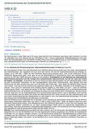 Verfahrenshinweise der Ausländerbehörde Berlin VAB A 32 Inhaltsverzeichnis A.32. Kindernachzug ................................................................................................................................ 253 32.0.1. Allgemeines ........................................................................................................................... 253 32.0.2. Nachweis der Personensorge bzw. Vaterschaftsanerkennungen im Inland ......................... 253 Sorgerechtsübertragung durch ausländische Gerichtsentscheidung ......................................... 253 Aufenthaltsrecht eines Elternteils nach § 28 Abs. 1 Nr. 1 oder Nr. 3 ........................................ 254 Maßgeblicher Zeitpunkt für Feststellung der Minderjährigkeit .................................................... 254 Aufnahme eines Kindes zu Adoptionsbewerbern ....................................................................... 255 32.1. Grundsätzliche Anmerkungen ................................................................................................ 256 Kindernachzug unter 16 Jahren ................................................................................................. 256 32.2. Sprachkenntnisse .................................................................................................................... 256 32.3. KIndernachzug bei gemeinsamen Sorgerecht und einem im Ausland aufhältlichen Elternteil ...... 256 32.4. Kindernachzug im Ermessen .................................................................................................... 257 A.32. Kindernachzug ( NeubestG ; 20.09.2016; 18.10.2016 ) 32.0.1. Allgemeines Der Nachzug setzt in allen Fällen des § 32 voraus, dass das Kind nicht verheiratet, geschieden oder verwitwet ist und das 18. Lebensjahr noch nicht vollendet hat (vgl. § 80 Absatz 3 Satz 1; hiervon abweichende Volljährigkeitsgrenzen nach dem Recht der Herkunftsstaaten sind unerheblich). Darüber hinaus kommt ein Kindernachzug nur nach § 36 Absatz 2 in Fällen einer außergewöhnlichen Härte im Ermessenswege in Betracht (zur Geltungsdauer vgl. A.7.2.3.1.). 32.0. 2. Nachweis der Personensorge bzw. Vaterschaftsanerkennungen im Inland Für den Nachweis der Personensorge bzw. Vaterschaftsanerkennungen im Inland gilt folgendes: Bei nicht-ehelichen Kindern kann die Vaterschaft durch öffentliche Beurkundung sowohl durch den Notar, das Amtsgericht, den Standesbeamten, das Jugendamt als auch durch das Gericht, bei dem die Vaterschaftsanerkennung anhängig ist, erfolgen (so § 1597 Abs. 1 BGB, der jede öffentliche Beurkundung genügen lässt). Zwar ist die Vaterschaft mit der öffentlichen Beurkundung gültig, ohne dass es auf die Beischreibung im Geburtenbuch durch den Standesbeamten ankommt (§ 1597 Abs. 2 BGB hat keinen Einfluss auf die Gültigkeit). Grundsätzlich ist zum Nachweis der Vaterschaft die Beischreibung abzuwarten und die Vorlage einer entsprechenden Geburtsurkunde, aus der der Vater des Kindes hervorgeht, zu verlangen . Ausreichend ist auch ein Auszug aus dem Geburtenregister, der die Vaterschaft belegt, soweit die dort verzeichneten Personalien mit den nachgewiesenen Personalien übereinstimmen. Dies deshalb, weil eine Anerkennung erst dann wirksam wird, wenn auch die Mutter des Kindes oder - wenn dieser die elterliche Sorge insoweit nicht zusteht - auch das Kind der Anerkennung zugestimmt haben (vgl. § 1595 BGB). Außerdem ist die Anerkennung nur wirksam, wenn nicht die Vaterschaft eines anderen Mannes besteht (§ 1594 BGB) und kann – etwa bei fehlender Zustimmung der Mutter - auch widerrufen werden (§ 1597 Abs. 3 BGB). Der Standesbeamte prüft vor der Beischreibung des Anerkenntnisvaters auch, ob die Mutter zum Zeitpunkt der Geburt mit einem anderen Mann verheiratet war, der dann als der Vater gilt. Dies kann von der Ausländerbehörde nicht rechtsverbindlich geprüft werden. Legt ein Betroffener nicht innerhalb von sechs Monaten nach der Geburt des Kindes die Geburtsurkunde bzw. keinen Auszug aus dem Geburtenregister und auch keinen Zwischenbescheid des Standesamtes vor oder weigert er sich, eine Geburtsurkunde beizubringen, so ist über den Antrag auf den Aufenthaltstitel nach Aktenlage zu entscheiden . Steht die Anerkennung der Vaterschaft fest, so genügen für den Nachweis der gemeinsamen Sorge der Eltern die öffentlich beurkundeten Erklärungen beider Eltern (vgl. hierzu § 1626 a sowie § 1626 d Abs. 1 BGB, der wiederum jede Form einer öffentlichen Beurkundung zulässt). Einer Bestätigung durch eine öffentliche Stelle bedarf es nicht. Dies auch deshalb, weil das Jugendamt lediglich verpflichtet ist, der allein sorgeberechtigten Mutter durch ein sogenanntes Negativattest zu bescheinigen, dass keine gemeinsamen Sorgeerklärungen abgegeben wurden. Die Ausstellung einer Bescheinigung durch das Jugendamt im Falle der gemeinsamen Sorge sieht das Gesetz nicht vor. Beachte: Eine Vaterschaftsanerkennung bleibt auch dann wirksam, wenn die Personalien des Betroffenen nicht eindeutig festgestellt sind (z.B. weil der Betroffene sich mit einer abgelaufenen Duldung ausgewiesen hat und/oder die eingetragenen Personalien nur auf eigenen Angaben beruhen). Für die Beurkundung genügt eine Identitätsfeststellung anhand eines Lichtbildes oder der Unterschrift. Hier kommt es lediglich darauf an, auszuschließen, dass ein Unbefugter unter fremden Namen Erklärungen abgibt, nicht jedoch, ob der Betroffene die in einem amtlichen Dokument enthaltenen Personalien zu Recht trägt. Sorgerechtsübertragung durch ausländische Gerichtsentscheidung Ist das Sorgerecht durch eine ausländische Gerichtsentscheidung auf einen Elternteil übertragen worden und kommt es Dieses PDF wurde erstellt am: 20.03.2017 Seite 253 von 753