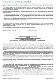 Verfahrenshinweise der Ausländerbehörde Berlin 3. Wir/Ich, ______________________________, werde/werden innerhalb eines Zeitraumes von drei Monaten nach Abschluss dieser Vereinbarung ein Integrationskursangebot des Bundesamtes für Migration und Flüchtlinge wahrnehmen und dieses bis zum Ablauf der Aufenthaltserlaubnis mit einem Abschlusstest beenden. Wir wollen/Ich will das Kursziel auch deshalb erreichen, damit eine Verständigung mit den Kindern in deutscher Sprache möglich ist. Die notwendigen Unterlagen wurden durch die Ausländerbehörde ausgehändigt. Eine Verpflichtung zur Teilnahme wurde auf der Grundlage des § 44a Abs. 1 Satz 1 Nr. 3 des Aufenthaltsgesetzes festgestellt, so dass ein Anspruch auf Teilnahme an einem Integrationskurs besteht. Uns/Mir ist bewusst, dass eine Verlängerung der Aufenthaltserlaubnis nur in Betracht kommt, wenn im Abschlusstest mündliche Sprachkenntnisse der Stufe A 2 des Gemeinsamen Europäischen Referenzrahmens für Sprachen (GERR) erreicht wurden. 4. Wir haben verstanden und sind damit einverstanden, dass eine positive Entscheidung für eine Verlängerung der Aufenthaltserlaubnis unserer Familie unter anderem davon abhängen wird, dass alle Familienmitglieder die hier getroffenen Vereinbarungen nach Maßgabe der § §§ 104a, 104b AufenthG erfüllt haben. Darüber hinaus werden wir auf Aufforderung der Ausländerbehörde sowie nach Ablauf der Aufenthaltserlaubnis die folgenden Nachweise erbringen: Lohnbelege, Kontoauszüge und Bescheinigungen des Arbeitgebers, aus denen sich die Höhe des Einkommens und der Fortbestand des Arbeitsverhältnisses bzw. der Arbeitsverhältnisse ergibt, sowie – soweit vorhanden - Bescheinigungen des Rentenversicherungsträgers über die erworbenen Ansprüche Bescheinigungen der Schule und/oder Kindertagesstätte über den regelmäßigen Besuch sowie die Vorlage von Schulzeugnissen des letzten Jahres vor Ablauf der Aufenthaltserlaubnis Bescheinigung über das Ergebnis des Abschlusstests des Integrationskurses bzw. eine Bescheinigung des Kursträgers über die ordnungsgemäße Teilnahme am Integrationskurs. Eine erste Aufforderung zur Vorlage der entsprechenden Nachweise wird voraussichtlich in einem Jahr nach Erteilung der Aufenthaltserlaubnis erfolgen. Wir werden auch zu weiteren Integrationsgesprächen erscheinen, wenn uns die Ausländerbehörde dazu einlädt. Eine von den Beteiligten unterschriebene Durchschrift dieser Vereinbarung erhalten wir zur Kenntnis. ……………………………… ……………………………………… gebilligt und Kenntnis genommen verlesen und erläutert 104a.s.3. Statistik Monatlich statistisch zu erfassen sind auch nach dem 31.12.2009 und bis zur abschließenden Bearbeitung aller vor dem 01.01.2010 gestellten Anträge auf Ersterteilung a. die Zahl der Anträge auf Ersterteilung: b. die Zahl der Ablehnungen der AE, insg.: wg. Passpflicht: wg. mangelnder Duldung bzw. Ausreisepflicht zum 01.07.2007: wg. wirtschaftl. Gründe: wg. Täuschung, vorsätzlichem Hinauszögern der Ausreise: wg. Ausweisungsgründen u.ä. Weiter sind ab 01.01.2010 nach einer bundeseinheitlichen Vorgabe monatlich statistisch zu erfassen die Zahl der Verlängerungsanträge, die Anzahl der Verlängerungen (Gesamt sowie nach Rechtsgrundlagen bzw. Fallkategorien des IMK- Beschlusses vom 3./4.12.2010) die Zahl der Ablehnungen (Gesamt sowie gesondert die, bei denen kein hinreichendes Bemühen zur Lebensunterhaltssicherung nachgewiesen wurde, oder es an den allgemeinen Erteilungsvoraussetzungen des § 104 a Abs. 1 S. 1 Nr. 1 -6, Abs. 3 fehlte die Zahl der sonstigen Erledigungen. Dieses PDF wurde erstellt am: 20.03.2017 Seite 478 von 753