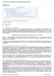Verfahrenshinweise der Ausländerbehörde Berlin VAB A 8 Inhaltsverzeichnis A.8. Verlängerung der Aufenthaltserlaubnis ..................................................................... 67 (2. RiLiUmG; AuslBeschR) ........................................................................................ 67 8.2. Ausschluss der Verlängerung ............................................................................ 67 8.3.0. Berücksichtigung der Verpflichtung zum Integrationskurs ...................... 67 8.3.1. Bescheinigung der Teilnahme am Integrationskurs ................................ 67 8.3.2. - 8.3.4. Verletzung der Teilnahmepflicht ................................................. 68 8.4. Ausnahmen von der Berücksichtigung der Verpflichtung zum Integrationskurs ...... 69 A.8. Verlängerung der Aufenthaltserlaubnis ( 2. RiLiUmG; AuslBeschR ) 8.1. einstweilen frei 8.2. Ausschluss der Verlängerung Von der Möglichkeit des § 8 Abs. 2, eine (weitere) Verlängerung bei der Erteilung oder Verlängerung einer Aufenthaltserlaubnis auszuschließen, wird grundsätzlich bei Erteilung einer Aufenthaltserlaubnis nach § 24 Abs. 1, § 25 Abs. 4 S. 1 sowie der letztmaligen Verlängerung einer Aufenthaltserlaubnis nach § 18 Abs. 4 AufenthG i.V.m. § 11 Abs. 2 BeschV (Regelung für die Beschäftigung von Spezialitätenköchen) Gebrauch gemacht. Dies geschieht dann gegebenenfalls durch die Auflage „Verlängerung der Aufenthaltserlaubnis ausgeschlossen (§ 8 Abs. 2 AufenthG)“ Bei dem (…) zweckgebundenen vorübergehenden Aufenthalten von Sprachlehrern (vgl. § 11 Abs. 1 BeschV) kommt die Vorschrift vor dem Hintergrund des besonderen öffentlichen Interesses an der Erteilung muttersprachlichen Unterrichts dagegen nicht zur Anwendung. Zu beachten ist in diesem Zusammenhang auch § 38 a Abs. 1 S. 2. Dieser stellt klar, dass eine formale Einschränkung der Verlängerbarkeit der AE nach § 38a gem. § 8 Abs. 2 vor dem Hintergrund des Artikels 22 der Daueraufenthalt-Richtlinie unzulässig ist. 8.3. 0. Berücksichtigung der Verpflichtung zum Integrationskurs Mit der Änderung des § 8 Abs. 3 S. 2 und 3 durch das 2. ÄndG wird die Möglichkeit zur Ablehnung der Verlängerung einer Aufenthaltserlaubnis ausdifferenziert. Bei wiederholter und gröblicher Verletzung der Pflicht zur Teilnahme am Integrationskurs (tatbestandliche Eingrenzung) soll im Falle einer Ermessensentscheidung, d.h. bei Nicht-Anspruchsberechtigten, versagt werden. Im Falle eines Anspruchs auf Verlängerung kann bei wiederholter und gröblicher Verletzung der Pflicht zur Teilnahme am Integrationskurs versagt werden, es sei denn der Ausländer erbringt den Nachweis, dass seine Integration in das gesellschaftliche und soziale Leben anderweitig erfolgt ist. § 8 Abs. 3 kommt allerdings in den Fällen des § 25 Abs. 1 – 3 und 4a nicht zur Anwendung (vgl. hierzu unten A.8.4.) Darüber hinaus sieht § 8 Abs. 3 mit Inkrafttreten des 2. Änderungsgesetzes eine Sanktionierung auch in den Fällen vor, in denen die Verpflichtung zur Integrationskursteilnahme durch uns auf Grund Leistungsbezugs oder besonderer Integrationsbedürftigkeit angeordnet wurde (Fälle des § 44 a Abs. 1 Nr. 2 a und b alter Fassung und Nr. 3 neuer Fassung). 8.3.1. Bescheinigung der Teilnahme am Integrationskurs Vor der Verlängerung von Aufenthaltserlaubnissen von Personen, die gem. § 44 a Abs. 1 S. 1 alter Fassung bzw. Abs. 1 Nr.1. oder Nr.3. verpflichtet worden sind, ist zwingend - im Regelfall schon mit dem Vorladungsschreiben - die Vorlage der Bescheinigung über die ordnungsgemäße oder ggf. erfolgreiche Teilnahme am Integrationskurs zu fordern (so ausdrücklich § 8 Abs. 3 S. 1 in der Fassung vom 01.07.2011, zur Unterscheidung vgl. Ausführungen unter A.43.2.2.). Dies gilt allerdings gem. § 8 Abs. 4 i.V.m. § 8 Abs. 3 S. 1 in der Fassung vom 01.07.2011 nicht in den Fällen des § 25 Abs. 1 -3 bzw. Abs. 4a. Unabhängig davon, ob die Kursteilnahme erfolgreich war, sind die Bescheinigungen zur Akte zu nehmen. Wird keine Bescheinigung über die erfolgreiche noch über die ordnungsgemäße Teilnahme vorgelegt, ist in Form eines einfachen Alltagsgesprächs zu prüfen, ob der Betroffene über ausreichende Sprachkenntnisse verfügt. Hiervon ist orientiert an § 17 Abs. 1 Nr. 1 i.V.m. § 3 Abs. 2 IntV immer dann auszugehen, wenn sich der Ausländer im täglichen Leben in seiner Umgebung selbstständig sprachlich zurechtfinden und entsprechend seinem Alter und Bildungstand ein Gespräch führen und sich schriftlich ausdrücken kann. Dieses PDF wurde erstellt am: 20.03.2017 Seite 67 von 753
