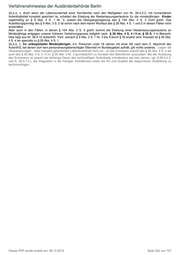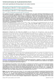 Verfahrenshinweise der Ausländerbehörde Berlin rechtmäßigem Aufenthalt im Bundesgebiet ein unbefristetes Aufenthaltsrecht oder eine Aufenthaltserlaubnis aufgrund des Freizügigkeitsabkommens mit der Schweiz besitzt (vgl. § 4 Abs. 3 StAG; zur Berechnung vgl. V A B . G . X V I I I ) : Hier wird der Erteilung des Visums zur Einreise regelmäßig zum voraussichtlichen Geburtstermin – frühestens jedoch 4 Wochen vor dem errechneten Termin - zugestimmt. Eine frühere Einreise kommt in diesen Fällen schon auf Grund der besonderen Bedeutung des Erfordernisses einfacher Sprachkenntnisse für eine erfolgreiche Integration nur in Betracht, wenn die Schwangere – z.B. wegen attestierten Vorliegens einer Risikoschwangerschaft – in besonderer Weise auf den Beistand des Ehemannes angewiesen ist. In diesen Fällen wird der Erteilung des Visums zur Einreise in der Regel frühestens ab dem vierten Schwangerschaftsmonat zugestimmt. Nachzug einer Schwangeren, die die Voraussetzungen für den Ehegattennachzug gem. § 28 Abs. 1 S. 5 i.V.m. § 30 Abs. 1 S. 1 Nr. 1 und 2 nicht erfüllt, zu ihrem deutschen Ehepartner: In diesen Fällen wird der Erteilung des Visums zur Einreise in der Regel frühestens ab dem vierten Schwangerschaftsmonat zugestimmt. Zur Prüfung durch die zuständige deutsche Auslandsvertretung ist eine geeignete ärztliche Bescheinigung vorzulegen, die insbesondere auch eine Aussage zum voraussichtlichen Geburtstermin beinhaltet. Nachzug eines Mannes nach Anerkennung der Vaterschaft und Abgabe einer gemeinsamen Sorgeerklärung zu einer Schwangeren, die entweder die deutsche Staatsangehörigkeit besitzt oder zum Zeitpunkt des voraussichtlichen Geburtstermins nach acht Jahren rechtmäßigem Aufenthalt im Bundesgebiet ein unbefristetes Aufenthaltsrecht oder eine Aufenthaltserlaubnis aufgrund des Freizügigkeitsabkommens mit der Schweiz besitzt (vgl. § 4 Abs. 3 StAG; zur Berechnung vgl. VAB.G.XVIII): Die Zustimmung zur Erteilung eines Visums erfordert zwingend den Nachweis - regelmäßig durch eine zeitgleiche Befragung der werdenden Eltern -, dass eine sozial-familiäre Beziehung zwischen dem werdenden Vater und dem Kind aufgenommen werden wird. Nachzug einer Schwangeren zu einem deutschen Staatsangehörigen, der die Vaterschaft für das werdende Kind anerkannt hat. Auch in diesen Fällen wird der Erteilung des Visums zur Einreise in der Regel frühestens ab dem vierten Schwangerschaftsmonat zugestimmt. Der Nachweis einer künftigen sozialen familären Beziehung sowie die Abgabe einer gemeinsamen Sorgeerklärung sind nicht erforderlich. Wird nach der Einreise mit einem D-Visum vor der Geburt ein Antrag auf Erteilung einer Aufenthaltserlaubnis gestellt und ist das Visum abgelaufen, ist eine Fiktionsbescheinigung nach § 81 Abs. 4, Abs. 5 AufenthG bis drei Monate nach dem errechneten Geburtstermin auszustellen. Die Erteilung einer Aufenthalterlaubnis gem. § 28 Abs. 1 S. 1 Nr. 3 kommt erst nach der Geburt und Vorlage einer Geburtsurkunde in Betracht, in die der jeweilige Vater auch als solcher eingetragen ist. Sind Mütter oder Väter von minderjährigen deutschen Kindern ohne ausreichende deutsche Sprachkenntnisse, wird die Aufenthaltserlaubnis gem. § 28 Abs. 1 Nr. 3 aufgrund ihrer besonderen Integrationsbedürftigkeit grundsätzlich lediglich für 13 Monate, bei Kindern unter sechs Monaten für 18 Monate und unter Verpflichtung zur Teilnahme an einem Integrationskurs erteilt. Ist der oder die Betroffene im Besitz eines Reiseausweises für Ausländer, Staatenlose oder Flüchtlinge mit einer Geltungsdauer von bis zu 18 Monaten wird die Geltungsdauer der des Reiseausweises angepasst. Damit wird dem Umstand Rechnung getragen, dass gerade dem Spracherwerb der Eltern für den Bildungserfolg ihrer Kinder erhebliches Gewicht zukommt, und kann das abgestufte Instrumentarium des § 8 Abs. 3 effizienter angewandt werden (vgl. A.8.3.). 28.1.2. frei 28.1.3. Zum Absehen von der Lebensunterhaltssicherung Für den Familiennachzug von Ehegatten zu deutschen Staatsangehörigen wurde durch das 2. Änderungsgesetz ein regelmäßiges Absehen von der Regelerteilungsvoraussetzung der eigenständigen Sicherung des Lebensunterhalts eingefügt, § 28 Abs. 1 S. 3. Nach Nr. 28.1.1.0 AufenthG-VwV kommt es bei Vorliegen besonderer Umstände auf diese Voraussetzung an. Nach den Hinweisen des BMI zum Richtlinienumsetzungsgesetz vom 2.10.2007 könne die Sicherung des Lebensunterhalts bei Vorliegen besonderer Umstände zur Voraussetzung gemacht werden. Besondere Umstände könnten bei Personen vorliegen, denen die Begründung der ehelichen Lebensgemeinschaft im Ausland zumutbar sei. Dies komme insbesondere bei Deutschen in Betracht , die geraume Zeit im Herkunftsland des Ehegatten gelebt und gearbeitet haben und die Sprache dieses Staates sprechen. Der bloße Umstand dass der deutsche Staatsangehörige noch eine andere Staatsangehörigkeit besitzt, ist für sich genommen dagegen kein Anknüpfungspunkt für eine Prüfung des § 28 Abs. 1 S. 3 (so Mitteilung des BMI vom 02.11.2012). Nach Nr. 28.1.1.1 AufenthG-VwV liegt bei einem begehrten Ehegattennachzug zu Spätaussiedlern ein besonderer Maßstab. Nach der vertriebenenrechtlichen Grundentscheidung, dass Spätaussiedler und ihre Familienangehörigen auf Grund ihres besonderen Kriegsfolgenschicksals in Deutschland Aufnahme finden sollen, sei die Wahrung der ehelichen Dieses PDF wurde erstellt am: 28.12.2016 Seite 239 von 747