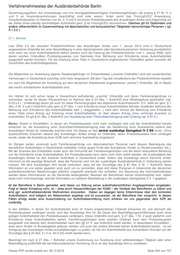 Verfahrenshinweise der Ausländerbehörde Berlin Betroffene nicht auf die Reisendenliste aufgenommen werden. Ist die Duldung dagegen ausweislich des AusReg über das Datum der beabsichtigten Wiedereinreise hinaus gültig, so kann IV Z 8 den Geduldeten grundsätzlich ohne Abstimmung mit dem jeweils zuständigen Sachgebiet und ohne Einsicht in die Ausländerakte zu nehmen in die Liste der Reisenden aufnehmen. Sind andere Sachgebiete - insbesondere IV R 1, 3 oder 4 - aktenführend, erfolgt die Aufnahme in die Reisendenliste nur im Einvernehmen mit dem zuständigen Sachgebiet. Merke: Bei Geduldeten ist auf der Liste gem. § 22 Absatz 2 anzuordnen, dass die Abschiebung nach der Wiedereinreise ausgesetzt wird. Diese Anordnung der aufschiebend bedingten Duldung ist erforderlich, weil mit einer Ausreise eine Duldung erlischt (vgl. Nr. 3.3.6 AufenthG VwV). Die Duldung, deren Wirkung aufschiebend bedingt mit der Wiedereinreise eintritt, ist auf der Schülersammelliste zu vermerken. Der Vermerk hat den Wortlaut: „Die Abschiebung des Schülers/der Schülerin/der Schüler ist nach der Wiedereinreise und bis zum … ausgesetzt (§ 22 Absatz 2 AufenthV).“ Für Schüler, die im Besitz einer Aufenthaltsgestattung .....(weggefallen)...sind, findet § 22 Abs. 2 entsprechend Anwendung. In jedem Fall wird bei Geduldeten und Gestatteten je eine Kopie der Reisendenliste zur Ausländerakte gegeben. Nach Abstimmung auf europäischer Ebene bestehen seitens des BMI keine Bedenken, auch Berufsschüler in die begünstigenden Regelungen mit einzubeziehen, so dass auch diese in die Liste der Reisenden aufgenommen werden können. Die Betreffenden sollten allerdings vorsorglich darauf hingewiesen werden, dass die Ausstellung einer Reisendenliste in diesen Fällen immer mit dem Risiko verbunden ist, dass die zuständigen Behörden in den Mitgliedstaaten - aus welchen Gründen auch immer - diese Liste nicht akzeptieren und deshalb Schwierigkeiten bei Einreise und Aufenthalt entstehen können. Nach dem Ausfüllen der Liste ist diese einem Beauftragten der Schule mit dem Hinweis auszuhändigen, dass die von der Schulleitung geforderten Angaben (Zeilen 1 - 4 sowie linkes Kästchen darunter) unbedingt einzutragen und vom Schulleiter - persönlich oder durch den allgemein bestellten Vertreter - gegenzuzeichnen sind. Merke: Die Eintragung und Gegenzeichnung hat gem. Nr. 3.3.6 AufenthG- VwV grundsätzlich vor der Bestätigung der Liste durch die Ausländerbehörde zu erfolgen. Die Gebühr für die Bestätigung einer Reisendenliste beträgt 5,00 € pro Person (§ 48 Abs. 1 Nr. 7). Über die ausgegebenen Vordrucke ist ein Nachweis zu führen, in dem das Ausstellungsdatum und der Name der Schule anzugeben ist. Eine Ablichtung der ausgestellten "Listen der Reisenden" ist in Stehordnern zu sammeln und 1 Jahr aufzubewahren. Ob die Reiseländer, die EU- und EWR - Staaten sind, die "Liste der Reisenden" anerkennen, ist jeweils vor Reiseantritt durch die Schule abzuklären. Lehrer, die sich wegen der Ausstellung einer Liste der Reisenden zum Zwecke von Klassenreisen informieren, sind auf diesen Umstand hinzuweisen. B.AufenthV.23. Befreiung für ziviles Flugpersonal frei B.AufenthV.24. Befreiung für Seeleute frei B.AufenthV.25. Befreiung in der internationalen zivilen Binnenschifffahrt frei B.AufenthV.26. Transit ohne Einreise; Flughafentransitvisum Anlage C wurde neu gefasst B.AufenthV.27. Befreiung für Personen bei Vertretungen ausländischer Staaten 27.0. Grundsatz § 27 AufenthV sieht Befreiungen für Personen vor, die sich im Zusammenhang mit der Tätigkeit der Vertretungen auswärtiger Staaten im Bundesgebiet aufhalten, und die nicht bereits völkerrechtlich und wegen § 1 Absatz 2 Nummer 2 oder 3 aus dem Anwendungsbereich des gesamten Aufenthaltsrechts ausgenommen sind. Laut Rundnote 6/2010 des Auswärtigen Amtes unterliegt die Beschäftigung von Unionsbürgern seit dem 16.02.2010 grundsätzlich nicht mehr der Dieses PDF wurde erstellt am: 28.12.2016 Seite 503 von 747