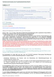 Verfahrenshinweise der Ausländerbehörde Berlin VAB A 17 Inhaltsverzeichnis A.17. Sonstige Ausbildungszwecke ................................................. 132 17.1. Arbeitsmarktzulassung bestimmter Berufsgruppen in Aus- bzw. Weiterbildung ...................................................... 132 17.1.1. Grundsätze zur Vorrangprüfung und Prüfung der Beschäftigungsbedingungen bei Ärzten zu einer Facharzt- oder sonstigen ärztlichen Weiterbildung .................................................................................................................................... 132 17.1.2. Beschäftigungsbedingungen bei Lehramts- und Rechtsreferendaren .................................................................. 133 17.1.3. Beschäftigungsbedingungen bei Volontären ......................................................................................................... 133 17.2. Erwerbstätigkeit während des Aufenthaltes zum Zweck der betrieblichen Aus- und Weiterbildung ......................... 133 17.3. Arbeitsplatzsuche und Aufnahme einer Erwerbstätigkeit nach erfolgreichem Abschluss einer qualifizierten Berufsausbildung ............................................................................................................................................................... 134 A.17. Sonstige Ausbildungszwecke (14.07.2015; 21.06.2016 ) Zustimmungen für verschiedene ärztliche Weiterbildungen 17.0 1. Auf die Regelungen der AufenthG- VwV zu § 17 wird verwiesen. Aus § 17 Abs. 1 i.V.m. § 16 Abs. 2 folgt, dass ein Wechsel des Aufenthaltszwecks außer in gesetzlichen Anspruchsfällen in der Regel nicht zugelassen werden soll. Eine Ausnahme vom Zweckwechsel gilt - auf Grund des § 17 Abs. 3 n.F. in den Fällen der Betrieblichen Ausbildung , - wenn nach Absolvierung der Aus- oder Weiterbildung einer Fachkraft mit einem deutschen Hochschulabschluss oder einem solchen vergleichbaren ausländischen Hochschulabschluss beabsichtigt ist, eine begonnene Promotion abzuschließen. Praktisch wird dies regelmäßig in Fällen der Facharztausbildung. Hier ist von einem Regel- Ausnahmefall des § 17 Abs. 1 S. 3 i.V.m. § 16 Abs. 2 auszugehen und der Zweckwechsel zuzulassen (bzgl. der Frage, ob in diesen Fällen § 16 Abs. 1 bzw. § 18 Abs. 4 in Betracht kommt vgl. A.16.3.1.2.). 17.0.2. Die Erteilung eines Visums zum Zweck der Ausbildung oder der erstmaligen Aufenthaltserlaubnis zu diesem Zweck setzt grundsätzlich den Nachweis deutscher Sprachkenntnisse des Niveaus B1 voraus. Hiermit soll gewährleistet werden, dass ausländische Staatsangehörige, die im Inland eine Ausbildung beginnen, nicht wegen fehlender Sprachkenntnisse an den Anforderungen der Ausbildungseinrichtung scheitern und die Ausbildung abbrechen müssen.Eine Ausnahme von dem Grundsatz ist dann zulässig, wenn glaubhaft gemacht wird, dass die Ausbildungseinrichtung dem Auszubildenden eine besondere Sprachförderung zukommen lässt. 17.1. Arbeitsmarktzulassung bestimmter Berufsgruppen in Aus- bzw. Weiterbildung 17.1.1. Grundsätze zur Vorrangprüfung und Prüfung der Beschäftigungsbedingungen bei Ärzten zu einer Facharzt- oder sonstigen ärztlichen Weiterbildung Die Bundesagentur für Arbeit (BA) kann gem. ihrer zum 01.05.2010 geänderten Weisungslage Beschäftigungen ausländischer Ärzte zur ärztlichen Weiterbildung gemäß § 17 zulassen zwecks mehrjähriger Weiterbildung zum Facharzt, wenn die Weiterbildung den Weiterbildungsordnungen der Landesärztekammern entspricht, oder sonstiger ärztlicher Weiterbildungen, die zeitlich und inhaltlich mit einem Regierungsstipendiatenprogramm gemäß § 15 Nr. 4 BeschV vergleichbar sind, oder für die gemäß § 34 Abs. 3 Nr. 2 BeschV ein für die Erreichung des Weiterbildungsziels geeigneter Weiterbildungsplan vorgelegt wird. Die Vorrangprüfung entfällt auf Weisung des Bundesministeriums für Arbeit und Soziales (BMAS) vom 22.06.2011, für in Humanmedizin ausgebildete Ärzte (nicht Zahn- oder Tierärzte) soweit die Arbeitsbedingungen denen vergleichbarer inländischer Beschäftigter entsprechen. Weiter ist die Bundesagentur bei Stipendiaten angewiesen, grundsätzlich davon auszugehen, dass die Beschäftigungsbedingungen denen vergleichbarer deutscher Ärzte in der Facharztausbildung oder der ärztlichen Weiterbildung entsprechen. In welcher Höhe ein Stipendium gewährt werden muss, damit diese interne Regelung der Bundesagentur greift, ist nicht geregelt. Ausweislich der DA-BeschV 2.15.402 der Bundesagentur, auf die in der Weisung des BMAS Bezug genommen Dieses PDF wurde erstellt am: 12.09.2016 Seite 132 von 750