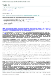 Verfahrenshinweise der Ausländerbehörde Berlin VAB A 29 A.29. Familiennachzug zu Ausländern (23.09.2015; Asylpaket II ) 29.1.1. bis 29.1.2. frei 29.2.1. Abweichungen bei anerkannten Flüchtlingen und sonstigen Inhabern humanitärer Titel Der Nachzug des Ehegatten oder des minderjährigen ledigen Kindes zum Inhaber einer Aufenthaltserlaubnis nach §§ 23 Abs. 4, 25 Abs. 1 oder Abs. 2 S.1 1.Alt. einer Niederlassungserlaubnis nach § 26 Abs. 3 oder einer Niederlassungserlaubnis nach § 26 Abs. 4, die nach Besitz einer Aufenthaltserlaubnis aufgrund subsidiären Schutzes erteilt wurde, ist erleichtert möglich. Merke: Mit Inkrafttreten des Gesetzes zur Einführung beschleunigter Asylverfahren (sog. Asylpaket II) zum 17.03.2016 ist der Familiennachzug zu subsidiär Schutzberechtigten mit einer Aufenthaltserlaubnis nach § 25 Abs. 2 S. 1 2. Alt. für zwei Jahre bis zum 16.03.2018 ausgeschlossen (vgl. auch zur Altfallregelung A.104.13. ). Wird der Familiennachzug zu einem Ausländer beantragt, der eine Aufenthaltserlaubnis nach § 25 Abs. 1 oder Abs. 2 S. 1 1.Alt. bzw. § 25 Abs. 3 i.V.m. § 60 Abs. 2, 3, 5, 7 S. 2 in der Fassung vor Inkrafttreten des QualRiLiUmsG besitzt, ist vor der Entscheidung über den Nachzugsantrag bzw. vor der Zustimmung im Einreiseverfahren beim BAMF anzu fragen, ob der Widerruf in Betracht kommt (vgl. Ausführungen unter A.26.2.). Dazu sind die Personalien des hier lebenden Familienangehörigen, zu dem der Nachzug erfolgen soll, mit einem entsprechenden Vermerk unter Angabe des BAMF-Aktenzeichens dem BAMF - Außenstelle Berlin, Askanierring 106, 13587 Berlin - zuzuleiten. Auf eine Anfrage beim BAMF ist nur dann zu verzichten, wenn bei einem Widerruf der Asylberechtigung bzw. der Zuerkennung der Flüchtlingseigenschaft bzw. der Zuerkennung der Flüchtlingseigenschaft nach Maßgabe von A.52.1.1.4. ein Widerruf des Aufenthaltstitels ohnehin nicht in Betracht käme. Seitens des BAMF wird auf eine Anfrage mitgeteilt werden, ob ein Widerrufsverfahren eingeleitet wird oder nicht. Wird ein Widerrufsverfahren eingeleitet, ist die Entscheidung über den Nachzugsantrag bzw. die Zustimmung zur Einreise bis zum bestands- oder rechtskräftigen Abschluss des Widerrufsverfahrens unter Hinweis auf das anhängige Verfahren aus zu setzen und dies der Auslandsvertretung mitzuteilen. So ist die Frage, ob der Aufenthaltstitel des den Nachzug vermittelnden Familienangehörigen fortbesteht, für die Entscheidung über den Antrag auf Familiennachzug bzw. die Zustimmung im Einreiseverfahren vorgreiflich. Beharrt der Antragsteller auf einer Entscheidung und fehlt es bereits an sonstigen Nachzugsvoraussetzungen, so ist der Antrag abzulehnen bzw. die Zustimmung zu versagen. Liegen alle sonstigen Nachzugsvoraussetzungen vor, bleibt es bei der Aussetzung. 29.2.2. Von den Voraussetzungen des § 5 Abs. 1 Nr. 1 und Nr. 2 ist – nach dem Inkraftreten des Gesetzes zur Neubestimmung des Bleiberechts und der Aufenthaltsbeendigung – auch dann abzusehen, wenn der Antrag auf Erteilung eines Aufenthaltstitels zum Familiennachzug innerhalb von 3 Monaten nach unanfechtbarer Zuerkennung des subsidiären Schutzes oder Erteilung einer Aufenthaltserlaubnis nach § 23 Abs. 4 gestellt wird. Beachte: Für den Familiennachzug zu anerkannten Flüchtlingen aus Syrien hat SenInnSport in den Fällen des § 29 Abs. 2 S. 2 eine Globalzustimmung erteilt, siehe B.AufenthV.32. 29.2.3 . § 29 Abs. 2 Satz 3 regelt den Fall der fristwahrenden Antragstellung durch den Stammberechtigten. Dabei ist die Antragstellung für ein Visum zum Zwecke des Familiennachzugs gem. § 29 Abs. 2 S. 3 durch den Stammberechtigten bei „seiner“ Ausländerbehörde, als der sachlich nicht zuständigen Behörde, nach richtiger Auffassung ebenso fristwahrend wie etwa eine entsprechende Nachfrage des Stammberechtigten beim BAMF, einem Innenministerium oder einer Aufnahmeeinrichtung. Daraus folgt allerdings nicht, dass die Ausländerbehörde in Visaverfahren für den Familiennachzug zu Asylberechtigten und anerkannten Flüchtlingen zuständig wird. Hier gilt § 71 Abs. 2. Bei der ABH vorsprechende bzw. nachfragende Stammberechtigte sind deshalb an die jeweils zuständige Auslandsvertretung zu verweisen. Es obliegt dann der zuständigen Auslandsvertretung, die entsprechende Anfrage bei einer Behörde im Inland als Antrag zu werten. 29.3.1. Beschränkung des Familiennachzugs bei humanitären Aufnahmen Besitzt ein Ausländer eine Aufenthaltserlaubnis nach §§ 22, 23 Abs. 1 oder 2, 25 Abs. 3 oder 4a Satz 1, 25a Abs. 1 oder 25b Dieses PDF wurde erstellt am: 12.09.2016 Seite 243 von 750