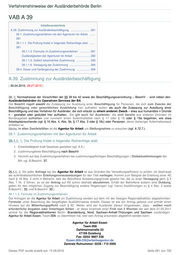 Verfahrenshinweise der Ausländerbehörde Berlin VAB A 39 Inhaltsverzeichnis A.39. Zustimmung zur Ausländerbeschäftigung ......................... 281 39.1. Zustimmungsverfahren mit den Agenturen für Arbeit ...... 281 39.1.1.1. Die Prüfung findet in folgender Reihenfolge statt: ...... 281 39.1.1.3. Formular im Zustimmungsverfahren ............. 281 Zuständigkeiten der Agenturen für Arbeit ................... 282 39.1.1.5. Zeitlich beschränkte Zustimmung ................. 283 39.1.1.6. Versagung der Zustimmung .......................... 284 39.4. Dauer und Verlängerung der Zustimmung ................. 284 A.39. Zustimmung zur Ausländerbeschäftigung ( 30.04.2015; 29.07.2015 ) 39. 0. Normadressat der Vorschriften der §§ 39 bis 42 sowie der Beschäftigungsverordnung – BeschV - sind neben den Ausländerbehörden die Operativen Services der BA . Die BeschV regelt sowohl die Zulassung zur Ausübung einer Beschäftigung für Personen, die sich zum Zwecke der Beschäftigung oder gewerblichen Ausbildung hier aufhalten wollen als auch die Zulassung zur Ausübung einer Beschäftigung und das Verfahren für Ausländer, die sich erlaubt zu einem anderen Zweck – etwa aus humanitäre n Gründe n - gestattet oder geduldet hier aufhalten.. Sie gilt auch für Ausländer, die sich bereits aus anderen Gründen im Bundesgebiet aufhalten und nunmehr einen Aufenthaltstitel nach § 17 oder § 18 oder § 19a begehren, wie etwa Arbeitsplatzsuchende (vgl. § 16 Abs. 4, Abs. 5b, § 17 Abs. 3 oder § 18c) oder Personen, deren bisheriger Aufenhaltszweck entfallen ist. Merke: In allen Zweifelsfällen ist die Agentur für Arbeit um Stellungnahme zu ersuchen (vgl. A.72.7.). 39.1. Zustimmungsverfahren mit den Agenturen für Arbeit 39.1.1. 1. Die Prüfung findet in folgender Reihenfolge statt: 1. Erwerbstätigkeit kraft Gesetzes gestattet (vgl. A.4.) 2. zustimmungsfreie Beschäftigung nach BeschV 3. Verzicht auf das Zustimmungsverfahren bei zustimmungspflichtigen Beschäftigungen ( Globalzustimmungen der BA; vgl. B.BeschV. 37. 39.1.1. 2. Vor jeder Anfrage bei der Agentur für Arbeit ist aus Gründen der Verwaltungseffizienz zu prüfen, ob überhaupt die aufenthaltsrechtlichen Erteilungsvoraussetzungen für den Titel vorliegen. Kommt zum Beispiel die Erteilung einer AE nach § 18 Abs. 2 nicht in Betracht, weil der Betroffene Ausweisungsgründe gesetzt hat, die zu einer Versagung gem. § 5 Abs. 1 Nr. 2 führen, so ist der Antrag auf AE schon deshalb abzulehnen. Erhält der Betroffene sodann eine Duldung, gelten für den möglichen Zugang zur Beschäftigung andere Regelungen (vgl. hierzu Ausführungen zu § 4 Abs. 3 sowie B.BeschV . 32. und B.BeschV. 33.). 39.1.1.3. Formular im Zustimmungsverfahren Die Anfragen an die Agentur für Arbeit um Zustimmung werden auf dem mit der hiesigen Regionaldirektion abgestimmten Formular unter Beachtung der beigefügten Ausfüllhinweise erstellt. Dieses ist wie ein Antrag gefasst und enthält einen Hinweis auf die Mitwirkungspflicht nach § 82. Weiter wird der Ausländer darauf hingewiesen, dass - sollten noch erforderliche Angaben oder Unterlagen fehlen - er diese innerhalb einer Frist von 2 Wochen der seit dem 01.05.2011 zentral für die Regionaldirektionen Berlin -Brandenburg, Nord, Sachsen-Anhalt-Thürungen und Sachsen zuständigen Agentur für Arbeit Essen, Team 009, zu übermitteln hat, weil sein Antrag ansonsten abgelehnt werden kann: Agentur für Arbeit Essen Team 009 Dahlmannstraße 23 47169 Duisburg Fax: 0203/ 9907 238 Essen.009-OS@arbeitsagentur.de Zentrale Rufnummer: 0228 / 713 2000 Dieses PDF wurde erstellt am: 12.09.2016 Seite 281 von 750