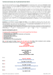 Verfahrenshinweise der Ausländerbehörde Berlin Auch sollte dem Antragsteller ein Formblatt „ Stellenbeschreibung“ ausgehändigt werden, welches der Arbeitgeber aus zu füllen und ebenfalls der zuständigen Agentur für Arbeit Essen (s.o.) zu übersenden hat. Hierauf folgt der Hinweis auf eine mögliche Versagung, wenn das Formblatt nicht ausgefüllt innerhalb einer Frist von 2 Wochen an die Agentur für Arbeit Essen übersandt wird. Der Antrag enthält weiter neben dem hiesigen Aktenzeichen, Angaben zu den persönlichen Daten des Ausländers, zur Rechtsgrundlage für den derzeitigen bzw. beabsichtigten Aufenthalt und zu Art und Bedingungen der beabsichtigten Beschäftigung. Weitere Unterlagen – etwa Arbeitsvertragsentwürfe o.ä. – sind für die Anfrage nicht erforderlich, da die Arbeitsagentur regelmäßig ohnehin mit dem Arbeitgeber in Kontakt treten wird (vgl. § 39 Abs. 2 S. 3). Wenn weitere Unterlagen bei der Ausländerbehörde vorhanden sind, sollten sie aber dem Anfrageformular als Anlage beigefügt werden. In besonderen Eilfällen sollten die Bitten um Zustimmung an die Agentur für Arbeit Essen per Fax übersandt werden. Das Fax sollte zusätzlich als "Eilsache" kenntlich gemacht sein, z.B. durch Zusätze wie "Antwort bis……..erbeten" oder "Vorsprachetermin am…….". Zusätzlich empfiehlt sich in Fällen besonderer Eilbedürftigkeit eine telefonische Kontaktaufnahme zum zuständigen ZAV-Stützpunkt. Wird eine Zustimmungsanfrage (Teil 1 und 2 des Formularsatzes) per Fax übersandt, sollte in jedem Fall auf die nachträgliche Übersendung des Originals auf dem Postwege verzichtet werden. Zuständigkeiten der Agenturen für Arbeit Zuständig ist grundsätzlich d ierjenige Agentur für Arbeit, in de ren Bezirk der Betrieb seinen Sitz oder seine Niederlassung hat, in der der Ausländer arbeiten soll. Im Zweifel ist der Betrieb die Betriebsstätte, dass heißt der Ort an dem der Ausländer tätig werden soll. Bei Beschäftigungen mit wechselnden Arbeitsstätten gilt der Sitz der für die Lohnabrechnung zuständigen Stelle als Beschäftigungsort . Für die Regionaldirektionen Berlin-Brandenburg, Nord, Sachsen-Anhalt-Thürungen und Sachsen ist zentral die Agentur für Arbeit Essen, Team 009, zuständig. Befindet sich der Betrieb in einem anderen Bundesland als den vorgenannten, ist die Zuständigkeit dem Internetauftritt der BA zu entnehmen. Spezielle Zuständigkeiten gelten für 1) Au-pairs und AEs nach § 38a AufenthG für eine (zustimmungspflichtige) Beschäftigung 2 ) Gastarbeitnehmer und Pflegekräfte, 3 ) Ferienbeschäftigungen ausländischer Studierender und Fachschüler, 4 ) studienfachbezogene Praktika, 5 ) internationalen Personalaustausch, 6 ) angestellte Künstler, 7 ) Spezialitätenköche und 8 ) Saisonarbeitnehmer und Schaustellergehilfen. Hier sind die A gentur für Arbeit Stuttgart oder die Agentur für Arbeit Köln in Bonn bundesweit zentral zuständig. Entsprechende Anfragen sind direkt per Fax nach Stuttgart bzw. Bonn zu übermitteln: Agentur für Arbeit Stuttgart Team 008 70145 Stuttgart Zentrale Rufnummer 0711 920-4500 Agentur für Arbeit Köln Team 008 Villemombler Str. 76 53107 Bonn Zentrale Rufnummer 0228 713-2000 Zu 1): Fax: 0711 / 920-3232 Stuttgart.008-OS@arbeitsagentur.de Zu 2 ): Fax: 0228 / 713 270-1166 Koeln-Gastarbeitnehmer@arbeitsagentur.de Zu 3 ): Fax: 0228 / 713-1525 Koeln-Ferienbeschaeftigung.008-OS@arbeitsagentur.de Zu 4 ): Fax: 0228/713-1037 Koeln-Studenten.008-OS@arbeitsagentur.de Zu 5 ): Fax: 0228/713-1091 Dieses PDF wurde erstellt am: 12.09.2016 Seite 282 von 750