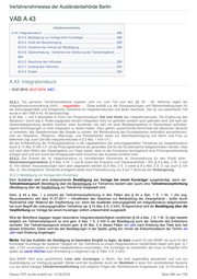 Verfahrenshinweise der Ausländerbehörde Berlin VAB A 43 Inhaltsverzeichnis A.43. Integrationskurs ..................................................................................... 288 43.0.3. Bestätigung zur Vorlage beim Kursträger .................................... 288 43.0.4. Inhalt der Bescheinigung ............................................................. 289 43.0.5. Verfahren bei Verlust der Bestätigung ......................................... 289 43.0.6. Datenerhebung - Verfahren bei Verletzung der Teilnahmepflicht ...... 289 43.2.2. Abschluss des IntKurses ............................................................. 289 43.3.1. Umfang des IntKurses ................................................................. 290 43.3.4. Kosten .......................................................................................... 290 A.43. Integrationskurs ( 15.07.2015; 26.07.2016; IntG ) 43.0.1. Die genauen Verfahrensabläufe ergeben sich nur zum Teil aus den §§ 43 - 45. Näheres regelt die Integrationskursverordnung (IntV) ... weggefallen ... . Diese enthält u.a. die Voraussetzungen und Rahmenbedingungen für die ordnungsgemäße und erfolgreiche Teilnahme an Integrationskursen und deren Nachweis. Der für uns wesentliche Teil wurde in den VAB.A.43.-45.berücksichtigt. § 43 Abs. 1 und 2 beinhalten in Form von Programmsätzen Ziel und Inhalt des Integrationskurses. Die Ergänzung des Absatzes 1 durch das 2. Änderungsgesetz wonach Integration nicht nur gefördert sondern auch gefordert wird, soll nach der Gesetzesbegründung deutlich machen, dass Ausländer, die sich mit einer Bleibeperspektive in Deutschland aufhalten, eigene Anstrengungen zu ihrer Integration zu leisten haben. Dazu gehört, ausreichende Kenntnisse der deutschen Sprache zu erwerben, das Gewaltmonopol des Staates zu achten, die Werteordnung des Grundgesetzes verbindlich anzuerkennen, sich zur Glaubens-, Religions-, Meinungs- und Pressefreiheit sowie zur Gleichberechtigung von Mann und Frau zu bekennen (vgl. auch Ziel des Integrationskurses in § 3 Abs. 1 IntV n.F.). Mit der Einbeziehung der Prüfungsteilnahme in die Legaldefinition der ordnungsgemäßen Teilnahme am Integrationskurs durch § 14 Abs. 6 IntV n.F. ist die Prüfungsteilnahme als generelles Ziel für die Kursteilnahme festgeschrieben worden. Dies soll nach dem Willen des Gesetzgebers zur Folge haben, dass in der Kurspraxis durchgehend eine Prüfungsvorbereitung erfolgen wird und sich somit die Erfolgsquoten beim Erreichen des Kursziels erhöhen wird. 43.0.2. Der Erwerb der im Integrationskurs zu vermittelnden Kenntnisse ist Voraussetzung für den Erhalt einer Niederlassungserlaubnis (§ 9 Abs. 2 Nr. 7 und 8) sowie der Erlaubnis zum Daueraufenthalt – EG (§ 9 a Abs. 2 Nr. 3 und 4). Von diesen Voraussetzungen kann aber abgesehen werden (§ 9 Abs. 2 S. 3 sowie § 9 a Abs. 2 S. 2; vgl. auch § 104 Abs. 2). Die erfolgreiche Teilnahme ermöglicht weiter eine Fristverkürzung von 8 auf 7 Jahre bei der Einbürgerung. 43.0.3. Bestätigung zur Vorlage beim Kursträger Dem Ausländer wird eine entsprechende Bestätigung zur Vorlage bei einem Kursträger ausgehändigt, wenn ein Teilnahmeanspruch (Bestätigung über die Berechtigung zur Teilnahme) besteht oder (auch) eine Teilnahmeverpflichtung (Bestätigung über die Verpflichtung zur Teilnahme) festgestellt wird. Gem. § 44 a Abs. 1 a erlischt die Teilnahmeverpflichtung in den Fällen des § 44 a Abs. 1 S. 1 Nr. 1 (für sog. Neuzuwanderer) seit dem 01.07.2011 – Inkrafttreten des Gesetzes zur Bekämpfung der Zwangsheirat - außer durch Rücknahme oder Widerruf der Verpflichtung nur, wenn der Ausländer ordnungsgemäß am Integrationskurs teilgenommen hat (zum Begriff der ordnungsgemäßen Teilnahme vgl. § 14 Abs. 6 S. 2 IntV). Entsprechend wird die Bestätigung über die Verpflichtung zur Vorlage bei einem Kursträger zeitlich unbeschränkt ausgestellt. Wird der Betroffene dagegen wegen besonderer Integrationsbedürftigkeit verpflichtet (§ 44 a Abs. 1 S. 1 Nr. 3) oder besteht lediglich ein Teilnahmeanspruch so wird gem. 6 Abs. 1 S. 3 IntV in der Bestätigung auch der Zeitpunkt des Erlöschens vermerkt. Der Teilnahmeanspruch erlischt gem. § 44 Abs. 2 in diesen Fällen ein Jahr nach Erteilung des Titels bzw. bei dessen Erlöschen. Daher wird bei den Bestätigungen in der Spalte „gültig bis“ immer als Erlöschensdatum der Termin ein Jahr nach Erteilung eingetragen. Merke: Auf das Ausfüllen der Bestätigung ist besondere Sorgfalt zu legen, da diese sowohl für das BAMF als auch für den Kursträger Grundlage der weiteren Tätigkeit ist. Zur Teilnahme an einem Integrationskurs Verpflichtete haben sich gem. § 7 Abs. 2 IntV unverzüglich zu einem Integrationskurs anzumelden. Der Kursträger ist verpflichtet, den Kurs im Regelfall nicht später als sechs Wochen nach Anmeldung zu beginnen (vgl. § 7Abs. 3 S. 2 IntV). Das BAMF führt eine ausführliche Liste aller Kursträger in Berlin. Sie wird regelmäßig aktualisiert und uns zur Aushändigung zur Verfügung gestellt. Weiter wird der Ausländer durch ein Merkblatt in einer ihm verständlichen Sprache u.a. auf seine etwaige Teilnahmeverpflichtung und mögliche Folgen der Nichtteilnahme hingewiesen (vgl. im Einzelnen § Dieses PDF wurde erstellt am: 12.09.2016 Seite 288 von 750