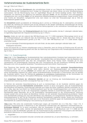 Verfahrenshinweise der Ausländerbehörde Berlin die Verpflichtung der Erziehungsberechtigten und der aufenthaltsrechtlich Verfahrensfähigen, den durchgehenden Besuch einer Schule sowie ggf. das Bemühen um Aufnahme bzw. Fortsetzung einer angemessenen Ausbildung der Kinder sicherzustellen, die Verpflichtung der Erziehungsberechtigten, den Besuch einer Kindertagesstätte für alle Kinder, die das zweite Lebensjahr zum Zeitpunkt der Erteilung der Aufenthaltserlaubnis vollendet haben bzw. während der Gültigkeit der Aufenthaltserlaubnisse vollenden, ohne schulpflichtig zu sein, sicherzustellen. Die Möglichkeit für alle Kinder ab Vollendung des zweiten Lebensjahres, einen Kindergarten zu besuchen, ergibt sich aus dem Schreiben der Senatsverwaltung für Inneres und Sport vom 04.12.2006, namentlich aus dem Verweis auf § 4 Abs. 3 des Kindertagesbetreuungsreformgesetzes. Dort heißt es: „Für Kinder, die das zweite Lebensjahr vollendet haben, liegt regelmäßig ein Bedarf zumindest für eine Halbtagsförderung in einer Tageseinrichtung vor, wenn die Förderung für die sprachliche Integration erforderlich ist.“ Die Erfüllung eines Anspruchs oder Förderungsbedarfs setzt allerdings einen vorherigen Antrag und die Feststellung nach § 7 des Kindertagesbetreuungsreformgesetzes voraus. Zuständig sind die Jugendämter der Bezirke. Es ist davon auszugehen, dass diese Voraussetzungen des § 4 Abs. 3 des Kindertagesbereuungsreformgesetzes von den Betroffenen stets erfüllt werden. Eine Betreuung durch Tagesmütter ist nicht ausreichend, da nicht sichergestellt ist, dass damit die integrationspolitische Zielsetzung der Vereinbarung erfüllt wird. Bei Familien sind alle Mitglieder in die gemeinsame Integrationsvereinbarung aufzunehmen. Diese ist dann von allen aufenthaltsrechtlich verfahrensfähigen Familienmitgliedern zu unterzeichnen. Alle Unterzeichner erhalten eine Durchschrift der Vereinbarung und sollen den Erhalt quittieren. Bei rechtsanwaltlich Vertretenen ist in jedem Fall der Rechtsanwalt einzubeziehen. Volljährige Kinder unterzeichnen eine eigene Integrationsvereinbarung. Das Integrationsgespräch und die Vorbereitung der Vereinbarung erfolgt in gesonderten Räumlichkeiten nach Terminvereinbarung. Die Einladung ergeht im Falle anwaltlicher Vertretung über den Rechtsanwalt. In dem Schreiben wird auf den möglichen Inhalt der Integrationsvereinbarung sowie darauf hingewiesen, dass alle Betroffenen erscheinen müssen und – so notwendig – für einen Sprachmittler zu sorgen ist. Die Verlängerung setzt regelmäßig voraus, dass alle sich aus der Integrationsvereinbarung ergebenden Verpflichtungen - auch von den anderen Familienmitgliedern – unter Berücksichtigung der Verlängerungsregelungen der §§ 104a, 104b erfüllt sind. Ist dies nicht der Fall, ist in Hinblick auf die integrationspolitische Zielsetzung der Regelung von einem atypischen Fall auszugehen und das von §104a Abs. 5 Satz 2 bzw. § 104 a Abs. 6 eröffnete Ermessen zu Lasten der Betroffenen auszuüben. Beispielhafte Muster für eine Integrationsvereinbarung finden sich am Ende dieser Weisung. 104a.4.2. Nebenbestimmungen Die Aufenthaltserlaubnis nach § 104a bzw. § 23 Abs.1 i.V.m. § 104a berechtigt in allen vier Fallgruppen unbeschränkt zur Erwerbstätigkeit. Sie ist mit dem Eintrag "Erwerbstätigkeit gestattet." zu versehen. Die bei der Ersterteilung verfügte auflösende Bedingung "Erlischt mit dem Bezug von Leistungen nach dem SGB XII." ist in Verlängerungsfällen nicht mehr zu verfügen. Weiter wird in allen Fällen die Auflage "Wohnsitznahme im Land Berlin erforderlich“ verfügt (vgl. hierzu im Einzelnen A.12.2.2.) 104a.5. Ersterteilungsdauer § 104a Abs. 5 Satz 1 regelt die Dauer der Aufenthaltserlaubnis bei der Ersterteilung für alle vier Fallgruppen des §104a bzw. § 23 Abs. 1 i.V.m. § 104a. Aus verwaltungspraktischen Gründen war eine Erteilung aller Aufenthaltserlaubnisse bis zum 31.12.2009 wie vom Gesetzgeber vorgesehen unmöglich. So hätte am 01.01.2010 über eine Vielzahl von Verlängerungsanträgen gleichzeitig entschieden werden müssen. Entsprechend den zeitlichen Vorstellungen des Gesetzgebers war die ersterteilte Aufenthaltserlaubnis anknüpfend an das Inkrafttreten der gesetzlichen Bleiberechtsregelung am 01.09.2007 daher in allen vier Fallvarianten des § 104a regelmäßig für zunächst 2 Jahre und vier Monate bzw. 28 Monate zu erteilen. Eine Ausnahme galt nur dann, wenn zum Zeitpunkt der Dieses PDF wurde erstellt am: 12.09.2016 Seite 474 von 750