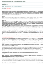 Verfahrenshinweise der Ausländerbehörde Berlin VAB A 81 A.81. Beantragung des Aufenthaltstitels (18.11.2016; 18.01.2017 ) 81.0. Grundsätzlich entfaltet ausschließlich die rechtzeitige Antragstellung die Erlaubnisfiktion nach § 81 (zur Ausnahme siehe unten 81.4.3.). In den Fällen, in denen die Rechtmäßigkeit des Aufenthaltes nach § 81 fingiert wird, kommt § 51 Abs. 1 Nr. 6 und 7 zur Anwendung. Denn der Betroffene kann im Falle seiner Ausreise nicht besser gestellt werden, als wenn ihm der begehrte Titel vor der Ausreise erteilt worden ist. 81.1. frei 81.2.0. Entgegen § 82 Abs. 3 S. 1 und Nr. 81.2.2 AufenthG-VwV wird es nicht für erforderlich gehalten, jeden Ausländer – gleichsam vorsorgend – durch ein Merkblatt auf seine gesetzliche Verpflichtung gem. § 81 Abs. 2 hinzuweisen. 81.2.1. frei 81.2.2. Problematisch ist der § 81 Abs. 2 S. 2 in den Fällen, in denen etwa die Mutter sich unerlaubt im Bundesgebiet aufhält. Handelt es sich nicht um eine Mutter, die im Asylverfahren steht oder ein Asylverfahren erfolglos durchlaufen hat, kann vor einer Entscheidung über den rechtzeitig gestellten Antrag das Kind nicht mit der Mutter zurückgeführt werden (Beachte in diesen Fällen auch die Anzeigepflicht des § 14a Abs. 2 AsylG). 81.3.0. § 81 Abs. 3 gilt nach der Systematik des § 81 nur für die erstmalige Erteilung des Aufenthaltstitels (zur Terminologie vgl. § 4 Abs. 1 S. 2). War beispielsweise ein Ausländer berechtigt visafrei einzureisen ( Positivstaater) oder war er vom Erfordernis eines Aufenthaltstitels befreit (vgl. etwa die Regelungen zu Ortskräften unter B.AufenthV.27 bzw. A.23.s.2), gilt demnach § 81 Abs. 3. Auch Angehörige von Staaten, die gem. § 41 AufenthV privilegiert sind, erhalten eine Fiktionsbescheinigung nach Absatz 3. (Zu Fällen in denen die Fiktionsbescheinigung dazu missbraucht wird, sich zum Zwecke der dauernden Arbeitsplatzsuche einen rechtmäßigen Aufenthalt zu verschaffen, beachte A.39.1.1.4. ) . Der Aufenthalt gilt bis zur Entscheidung als erlaubt (§ 81 Abs. 3 S. 1) bzw. es gilt die Abschiebung als ausgesetzt (§ 81 Abs. 3 S. 2). Au ch au f Ausländer, die im Besitz eines Schengen a ufenthaltstitels sind, kann nur § 81 Abs. 3 Anwendung finden , da sie nicht im Besitz eines Aufenthaltstitels im Sinne von § 4 Abs. 1 Satz 2 sind (vgl. A.4.1.2.), sich jedoch zugleich rechtmäßig im Bundesgebiet aufhalten dürfen. Für Personen, die unerlaubt eingereist sind (z.B. Negativstaater ohne Visum; vgl. § 58 Abs. 2 S. 1 Nr. 1), die noch nicht erstmalig eine Aufenthaltserlaubnis beantragt haben (§ 58 Abs. 2 S. 1 Nr. 2) oder auf Grund eines vollziehbaren Verwaltungsaktes ausreisepflichtig sind (vgl. § 58 Abs. 2 S. 2), und sich damit nicht rechtmäßig im Bundesgebiet aufhalten, tritt die Fiktionswirkung gem. § 81 Abs. 3 ebenfalls nicht ein. Dies folgt aus dem vorrangig anzuwendenden § 58 Abs. 2. Ist der Ausländer auf Grund eines Verwaltungsaktes, der nicht vollziehbar ist, ausreisepflichtig, gilt Gleiches. In diesen Fällen ist die Bescheinigung L 4048 auszustellen. Allein die Buchung eines Termins über die OTV/Internet/D115 stellt noch keine Antragstellung im Sinne von § 81 Abs. 3 dar und vermag daher auch keine Fiktionswirkung auszulösen. Es gilt analog das unter A.81.4.0. beschriebene Verfahren. Mangels eines Aufenthaltstitels im Sinne des § 4 Abs. 3 ist die Fiktionsbescheinigung grundsätzlich mit den Nebenbestimmungen „Erwerbstätigkeit nicht gestattet. Bei Verstößen droht Unternehmer/Arbeitgeber Bußgeld bis zu 500.000 Euro.“ zu erteilen . 81.3.1. Bezüglich der Ausstellung der Bescheinigung und der Erhebung der Gebühr gelten für die Positivstaater die verfahrensbezogenen Ausführungen zu § 81 Abs. 4 entsprechend. Merke: Die Fiktionsbescheinigung, die nach Absatz 3 erteilt wird, ersetzt keinen Aufenthaltstitel, sondern bewirkt nur die Fiktion der Rechtmäßigkeit des Aufenthalts. Dies kommt durch die unterschiedlichen Formulierungen der Absätze 3 und 4 zum Ausdruck. Anders als die Fiktionsbescheinigung, die nach Absatz 4 erteilt wird, ermöglichst die Fiktionsbescheinigung Dieses PDF wurde erstellt am: 01.06.2017 Seite 412 von 752