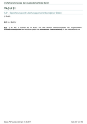 Verfahrenshinweise der Ausländerbehörde Berlin VAB A 91 A.91. Speicherung und Löschung personenbezogener Daten (2. ÄndG) 91.1. bis 91.2 frei 91.3. § 91 Abs. 3 schließt die im BDSG und dem Berliner Datenschutzgesetz neu aufgenommene Widerspruchsmöglichkeit der Betroffenen gegen eine automatisierte Datenverarbeitung für das Ausländerrecht aus. Dieses PDF wurde erstellt am: 01.06.2017 Seite 437 von 752