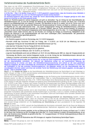 Verfahrenshinweise der Ausländerbehörde Berlin oder sich nachweislich – etwa durch Vorlage von Bewerbungsschreiben, den Nachweis von Vorstellungsgesprächen und/oder Teilnahme an berufsvorbereitenden oder –qualifizierenden Maßnahmen – kontinuierlich um eine Beschäftigung oder einen Ausbildungsplatz bemüht oder ein Vertrag über eine laufende oder demnächst zu beginnende berufsvorbereitende Maßnahme vorgelegt wird (bei berufsvorbereitenden Maßnahmen muss sich aus dem Vertrag der Inhalt und die Dauer der Maßnahme ergeben sowie ersichtlich sein, bis wann mit einer Entscheidung über die anschließende Aufnahme der eigentlichen Berufsausbildung zu rechnen ist), oder der Lebensunterhalt vollständig gesichert werden kann. Gleiches gilt, wenn der Ausländer noch keinen anerkannten schulischen oder beruflichen Bildungsabschluss erworben hat, sich aber aktuell in einer solchen Ausbildung befindet. Im Übrigen wird die Verlängerung nach dem üblichen Verfahren, d.h. mit schriftlicher Anhörung, versagt (zur Anwendung des § 35 Abs. 4 Satz 2 bzw. Abs. 5 s.u.). Der Betroffene kann sich bezüglich der Äußerung zu den für die Entscheidung erheblichen Tatsachen auch eines Mitgliedes der Härtefallkommission oder eines sonstigen Bevollmächtigten bedienen. Alle Vorschläge zu versagenden Entscheidungen werden vor Abgang der Referats- oder Abteilungsleitung m.d.B. um Billigung/Entscheidung vorgelegt. Bis zur Entscheidung erhalten die Betroffenen eine Fiktionsbescheinigung für 2 Monate. Gegen versagende Bescheide kann Fachaufsichtsbeschwerde bei der Senatsverwaltung für Inneres und Sport eingelegt werden. Die Einlegung der Beschwerde rechtfertigt weder die Erteilung einer Fiktionsbescheinigung noch einer Duldung. Besondere Umstände des Einzelfalls, die die Versagung zu einer außergewöhnlichen Härte machten oder zu nicht zu vertretenden Ausreisehindernissen führen, wird ggf. durch Erteilung eines Titels gem. § 25 Abs. 4 Satz 2 bzw. § 25 Abs. 5 Rechnung getragen. In diesen Fällen bedarf es keiner Vorlage an die Referats- oder Abteilungsleitung bzw. die zu schaffende zentrale Stelle. 23a.2.2 . bis 23a.3.2. frei Dieses PDF wurde erstellt am: 07.11.2016 Seite 198 von 747