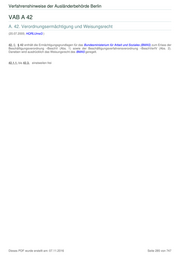 Verfahrenshinweise der Ausländerbehörde Berlin VAB A 42 A. 42. Verordnungsermächtigung und Weisungsrecht (20.07.2005; HQRLUmsG ) 42. 0. § 42 enthält die Ermächtigungsgrundlagen für das Bundesministerium für Arbeit und Soziales (BMAS) zum Erlass der Beschäftigungsverordnung –BeschV (Abs. 1) sowie der Beschäftigungsverfahrensverordnung –BeschVerfV (Abs. 2). Daneben wird ausdrücklich das Weisungsrecht des BMAS geregelt. 42.1.1. bis 42.3. einstweilen frei Dieses PDF wurde erstellt am: 07.11.2016 Seite 285 von 747