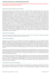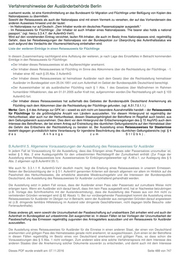 Verfahrenshinweise der Ausländerbehörde Berlin VAB B.AufenthV.1. - 14. Passpflicht für Ausländer Inhaltsverzeichnis B.AufenthV.1. - 14. Passpflicht für Ausländer ............................................................................................................ 486 ........................................................................................................................................................................... 620 B.AufenthV.1. Begriffsbestimmungen ................................................................................................................. 486 B.AufenthV.2. Erfüllung der Passpflicht durch Eintragung in den Pass eines gesetztlichen Vertreters .............. 486 B.AufenthV.3. Zulassung nichtdeutscher amtlicher Ausweise als Passersatz .................................................... 486 B.AufenthV.4. Deutsche Passersatzpapiere für Ausländer ................................................................................. 486 Eintrag "Personalien beruhen auf eigenen Angaben" .................................................................................. 487 Kinderreiseausweise .................................................................................................................................... 487 Reiseausweise für Flüchtlinge ..................................................................................................................... 487 Liste der weiteren Einträge in einen Reiseausweis für Flüchtlinge .............................................................. 488 B.AufenthV.5. Allgemeine Voraussetzungen der Ausstellung des Reiseausweises für Ausländer .................... 488 Unzumutbarkeit der Erfüllung der Wehrpflicht ............................................................................................. 489 Unzumutbarkeit aus anderen Gründen ....................................................................................................... 489 Zumutbarkeit einer Nachregistrierung im Heimatstaat ................................................................................. 490 Zumutbarkeit eines Kopftuchs ..................................................................................................................... 490 Zumutbarkeit von Gebühren ........................................................................................................................ 490 Zumutbarkeit bei drohender Strafverfolgung ............................................................................................... 490 Zumutbarkeit bei Asylgründen ..................................................................................................................... 491 B.AufenthV.6. Ausstellung des Reiseausweises für Ausländer im Inland ........................................................... 491 B.AufenthV.7. Ausstellung des Reiseausweises für Ausländer im Ausland ....................................................... 492 B.AufenthV.8. Gültigkeitsdauer des Reiseausweises für Ausländer ................................................................... 492 B.AufenthV.9. Räumlicher Geltungsbereich des Reiseausweises für Ausländer ............................................... 492 B.AufenthV.10. Sonstige Beschränkungen im Reiseausweis für Ausländer ....................................................... 492 B.AufenthV.11. Verfahren der Ausstellung oder Verlängerung des Reiseausweises für Ausländer im Ausland ...... 492 B.AufenthV.12. Grenzgängerkarte ...................................................................................................................... 492 B.AufenthV.13. Notreiseausweis ......................................................................................................................... 492 B.AufenthV.14. Befreiung von der Passpflicht im Rettungsfällen ....................................................................... 493 B.AufenthV.1. - 14. Passpflicht für Ausländer (14.07.2015; ÄndV AufenthV ; 21.06.2016 ) B.AufenthV.1. Begriffsbestimmungen frei B.AufenthV.2. Erfüllung der Passpflicht durch Eintragung in den Pass eines gesetztlichen Vertreters § 2 enthält eine allgemeine Regelung für alle minderjährigen Ausländer, die in Pässen oder Passersatzpapieren ihrer gesetzlichen Vertreter – zumeist der Eltern - eingetragen sind. Danach können Ausländer, die das 16. Lebensjahr noch nicht vollendet haben, die Passpflicht auch durch Eintragung in den Pass eines gesetzlichen Vertreters erfüllen; ab dem 10. Lebensjahr muss ein Lichtbild des Kindes in einen solchen Pass eingebracht worden sein. Die Eltern sind verpflichtet, dafür zu sorgen, dass ihre Kinder der Passpflicht genügen (§ 80 Abs. 4 AufenthG). Die Ausländerbehörde soll die Eltern auf diese Verpflichtung hinweisen. Zum Erfordernis eines Lichtbildes vgl. auch § 60. B.AufenthV.3. Zulassung nichtdeutscher amtlicher Ausweise als Passersatz frei B.AufenthV.4. Deutsche Passersatzpapiere für Ausländer Dieses PDF wurde erstellt am: 07.11.2016 Seite 486 von 747