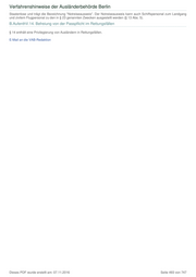 Verfahrenshinweise der Ausländerbehörde Berlin Die Reiseausweise für Ausländer, Flüchtlinge und Staatenlose werden seit 01.11.2007 grundsätzlich durch die Bundesdruckerei gedruckt. Seit dem 29.06.2009 sind dabei der Bundesdruckerei neben dem Lichtbild auch Fingerabdrücke des künftigen Reiseausweisinhabers zu übermitteln, was ausschließlich auf elektronischem Weg erfolgt. Bei der Aushändigung durch die ABH ist der Betroffene durch ein entsprechendes Hinweisblatt darauf aufmerksam zu machen, dass eine Neuausstellung rechtzeitig vor Ablauf (d.h. 10 Wochen vorher) zu beantragen ist. Zu beachten ist, dass eine Verlängerung des Reiseausweises mit biometrischen Merkmalen nicht möglich ist. Die Ausstellung eines Reiseausweises ohne Speichermedium als "vorläufiger Reiseausweis" kommt nur ausnahmsweise in Betracht (insofern zu eng Nr. 3.3.1.10. AufenthG-VwV). Die Gültigkeitsdauer darf ein Jahr nicht überschreiten, hierin ist eine etwaige Verlängerung bereits eingerechnet. Eintrag "Personalien beruhen auf eigenen Angaben" Gemäß § 4 Abs. 6 Satz 1 kann der Eintrag „Personalien beruhen auf eigenen Angaben“ in den Reiseausweis für Ausländer genommen werden. Bei der Entscheidung, ob der Eintrag vorgenommen wird, handelt es sich um eine Ermessensentscheidung. Das Ermessen ist in der Regel zugunsten des Eintrags auszuüben, wenn keinerlei belastbare Identitätsnachweise vorliegen, z.B. wenn im Asylverfahren keinerlei Identitätsnachweise vorgelegt werden und subsidiärer Schutz zuerkannt wird. Gemäß § 4 Abs. 6 Satz 2 kann der Eintrag auch in einem Reiseausweis für Staatenlos bzw. Flüchtlinge vorgenommen werden, wenn ernsthafte Zweifel an den Identitätsangaben des Antragstellers bestehen. Für ernsthafte Zweifel an den Angaben reicht der bloße Umstand, dass keinerlei Identitätsnachweise vorgelegt wurden nicht. Vielmehr müssen konkrete Anhaltspunkte, z.B. bei einer polizeilichen Kontrolle aufgefundene Urkunden, die auf eine andere Identität hindeuten, vorliegen. Kinderreiseausweise Kinder bis zur Vollendung des 12. Lebensjahres erhalten einen Reiseausweis ohne Speichermedium, der höchstens 6 Jahre, längstens jedoch bis zur Vollendung des 12. Lebensjahres, gültig sein darf. Daraus folgt, dass Kinder nicht mehr in die Reiseausweise ihrer Eltern eingetragen werden. § 4 Abs. 1 S. 3 2.HS sieht auch die Möglichkeit der Ausgabe von Passersatzpapieren mit Speichermedium an Kinder vor Vollendung des 12. Lebensjahres in begründeten Fällen vor, Anwendungsfälle hierfür werden insbesondere bei nachgewiesenen Reisen oder neu auszustellendem Reiseausweis kurz vor dem 12. Geburtstag gesehen. Erlaubt ist eine Antragsentgegennahme von bis zu sechs Monaten vor diesem Datum. Aus Gründen der Verwaltungseffizienz kann für Kinder ab Vollendung des 6. Lebensjahres ein Passersatzpapier mit Speichermedium ausgestellt werden, sofern sie einen elektronischen Aufenthaltstitel erhalten. Auch die Kinderreiseausweise sind mit einem Lichtbild zu versehen; dies gilt unabhängig vom Lebensalter des Kindes, also auch bei einem Säugling. Zu den besonderen Anforderungen an Lichtbilder von Kindern, Kleinkindern und Säuglingen wird auf die von der Bundesdruckerei herausgegebene Foto-Mustertafel für Personaldokumente verwiesen. Soll im Ausnahmefall ein biometrischer Reiseausweis für ein Kind unter 6 Jahren ausgestellt werden, sind keine Fingerabdrücke zu nehmen. Kinderreiseausweise, die vor dem 01.11.2007 ohne Lichtbild ausgestellt wurden, behalten nach der Übergangsregelung des § 18 Abs. 1 der Verordnung zur Durchführung des Passgesetzes vom 19.10.2007 für den jeweiligen Gültigkeitszeitraum ihre Geltung. Merke: Der Pass muss vom Kind unterschrieben werden, wenn es zum Zeitpunkt der Beantragung des Passes das 10. Lebensjahr vollendet hat. Abs. 2 und 3 regeln detailliert die Voraussetzungen für die Einziehung des Passersatzes und ein Beteiligungserfordernis der im Inland zuständigen Ausländerbehörde bei Entziehung des Passersatzes im Ausland. Reiseausweise für Flüchtlinge Wird dem Inhaber eines Nationalpasses ein Reiseausweis für Flüchtlinge ausgestellt, ist ihm der Nationalpass gleichwohl zu belassen. Handelt es sich um einen anerkannten Asylberechtigten oder um einen Ausländer, dem die Flüchtlingseigenschaft Dieses PDF wurde erstellt am: 07.11.2016 Seite 487 von 747