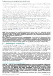 Verfahrenshinweise der Ausländerbehörde Berlin Die Verlängerung des Schengen-Visums kommt nur ausnahmsweise in Betracht, wenn sich nach der Erteilung des Visums neue Tatsachen ergeben haben, der Antrag begründet ist (insbesondere höhere Gewalt oder humanitäre Gründe - Art. 33 Abs. 1 - bzw. schwerwiegenden persönliche Gründe - Art. 33 Abs. 2 Visakodex), keine Änderung des Aufenthaltszwecks beabsichtigt ist. Wenn diese Ausnahmegründe vorliegen, kann die Gültigkeit eines für einen kürzeren Zeitraum als 90 Tage erteilten Visums für eine Aufenthaltsdauer von höchstens 90 Tage in einem Zeittraum von 180 Tagen von dem Tag der ersten Einreise an verlängert werden, vorausgesetzt, dass der Lebensunterhalt während der Dauer des beabsichtigten Aufenthalts gesichert ist. Die Aufnahme einer Erwerbstätigkeit ist durch Auflage auszuschließen, sofern die Auslandsvertretung die Auflage nicht bereits verfügt hatte. Gründe für eine Ausnahme liegen z.B. vor bei eilbedürftiger ärztlicher Behandlung oder Reiseunfähigkeit des Antragstellers, bei plötzlicher Erkrankung oder sonstigem besorgniserregenden Ereignis bei nahen Familienangehörigen oder bei dringenden geschäftlichen oder beruflichen Gründen, die vor der Einreise nicht abschätzbar waren. Das für die Angehörigen bestimmter Staaten bzw. Inhaber bestimmter Pässe bestehende "Konsultationsverfahren" nach Art. 22 Visakodex sieht vor, dass die zentralen Behörden von der ausstellenden Auslandsvertretung zu konsultieren sind. Diese Konsultation erfolgt grds. über das Visainformationssystem - VIS - per VIS-Mail. Zum gegenwärtigen Zeitpunkt besteht die Möglichkeit der Konsultation auf technischem Weg zunächst nur bezogen auf den nordafrikanischen Raum (s. hierzu nachfolgend 6.s.2.). In den Fällen des Art. 22 Visakodex darf ein Visum nur in besonderen Ausnahmefällen und in der Regel nur als nationales Visum mit dem Zusatz auf einem gesonderten Etikett "Gilt nicht für die anderen Schengenstaaten" verlängert werden. Wird ein solches Visum aus besonderen Gründen ausnahmsweise nicht als nationales Visum verlängert, ist bis auf weiteres - so eine Unterrichtung über VIS-Mail noch nicht möglich ist - wie bisher in den Fällen, in denen ein anderer Staat das Schengen-Visum ausgestellt hat, das Auswärtige Amt, Postfach 11 48, 53001 Bonn, zu unterrichten, das die zentrale Behörde des visumsausstellenden Staates informiert. Die Mitteilung muss die Personalien, Art und Nummer des Reisedokuments, Nummer der Visamarke, Visakategorie, Datum und Ort der Visumsstellung und die verlängerte Gültigkeits- und Aufenthaltsdauer enthalten. Die Verlängerung eines C-Visums als C-Visum erfolgt auf dem dafür vorgesehenen Klebeetikett. Beim Ausfüllen des Etiketts ist folgendes zu beachten: In dem Feld "Dauer des Aufenthalts ...Tage" ist die Zahl der Tage, um die das Visum verlängert wird, mit zwei Ziffern anzugeben, bei Verlängerung um weniger als 10 Tage ist die erste Ziffer eine Null. Gleiches gilt für die Eintragung des Datums im Feld "Gültigkeitsdauer", wobei Tages-, Monats- und Jahreszahl (zweistellig) mit Bindestrichen getrennt werden (z.B. 15-04-10). Die Felder betr. die räumliche Gültigkeit, die Zahl der Einreisen und die Art des Visums sind in der Regel entsprechend den Eintragungen in dem ursprünglichen Visum auszufüllen. Werden eine oder mehrere zusätzliche Einreise(n) gestattet, ist auch diese Zahl zweistellig einzutragen. Die Erwerbstätigkeit ist durch Auflage auszuschließen. Die Gesamtgültigkeit als "C-Visum" darf 90 Tage pro Halbjahr nicht überschreiten. Bei Verlängerung des C-Visums bis zu 3 Monaten mit Beschränkung auf einen Teil des Schengenraumes ist in dem Feld "gültig für" unter Nennung der ausgenommenen Schengenstaaten einzutragen: "mit Ausnahme von ...". Bei Beschränkung des C-Visums auf die Bundesrepublik Deutschland ist das Länderkennzeichen "DE" einzutragen. In dem Feld "Visumkategorie" jeweils der Buchstabe "C". Eine etwaige räumliche Beschränkung eines Visums ist nicht zu streichen, weil in diesen Fällen davon auszugehen ist, dass die Einreisevoraussetzungen nach Art. 6 Abs. 1 Grenzkodex nicht erfüllt waren und das Visum für den angegebenen Staat nur ausnahmsweise erteilt wurde. Alle Angaben sind auf dem Etikett aufzudrucken. Handschriftliche Änderungen dürfen nicht vorgenommen werden. Wird auf einem Etikett ein Irrtum festgestellt, so wir das Etikett durch ein Kreuz ungültig gemacht und ein neues Etikett angebracht (Art. 27 Abs. 3 i.V.m. Art. 28 Abs. 1 Visakodex). Die Höhe der Verwaltungsgebühr für die Verlängerung eines C-Visums ergibt sich aus Art. 33 i.V.m. Art. 16 Visakodex. Die Verlängerung des C-Visums erfolgt danach grundsätzlich gebührenfrei; lediglich in den Fällen, in denen ein Ausländer sein Visum nicht voll ausgeschöpft hat, weil er erst verspätet in die Bundesrepublik Deutschland oder einen anderen Schengenstaat eingereist ist, und das Visum um den Zeitraum, der nicht genutzt worden ist, verlängert wurde (ein neuer Unterhaltsnachweis ist in diesen Fällen nicht erforderlich), ist eine Gebühr in Höhe von 30,00€ zu erheben, wobei die Befreiungstatbestände des Art. 16 Abs 4 Visakodex zu berücksichtigen sind. Wird die Verlängerung des Visums abgelehnt, ist im Pass zu vermerken: "Verlängerungsantrag abgelehnt am ...“ Der Dieses PDF wurde erstellt am: 07.11.2016 Seite 54 von 747