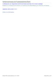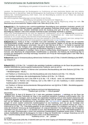 Verfahrenshinweise der Ausländerbehörde Berlin VAB B.BeschV.34.-37. Verfahrensregelungen Inhaltsverzeichnis B.BeschV.34.-37. Verfahrensregelungen .................... 566 B.BeschV.34. Beschränkung der Zustimmung .... 566 B.BeschV.35. Reichweite der Zustimmung .......... 566 B.BeschV.36. Zustimmungsfiktion, Vorabprüfung ...... 566 B.BeschV.37. Härtefallregelung .......................... 566 B.BeschV.34.-37. Verfahrensregelungen ( 17.12.2013; 30.04.2015 ) B.BeschV.34. Beschränkung der Zustimmung Normadressat ist die Bundesagentur. B.BeschV.35. Reichweite der Zustimmung BeschV.35.1. – 35.4. frei BeschV.35.5.1. Macht ein seit bereits einem Jahr im Bundesgebiet beschäftigter Ausländer geltend, nunmehr Anspruch auf eine unbefristete Zustimmung zur Beschäftigung zu haben, ist dieser Antrag der zuständigen Agentur für Arbeit im Rahmen des Zustimmungsverfahrens per Fax zu übermitteln. (vgl. A.39.1.1.) BeschV.35.5.2 . § 35 Abs. 5 S. 2 stellt klar, dass die Erleichterung des Satzes 1 für Inhaber von Aufenthaltserlaubnissen zum Zwecke der Beschäftigung, die nach der BeschV zeitlich begrenzt sind, nicht gilt. Dies betrifft insbesondere den internationalen Personalaustausch (§ 10), Sprachlehrer und Spezialitätenköche (§ 11), Au-pair-Beschäftigungen (§ 12), Hausangestellte von Entsandten (§ 13), Haushaltshilfen (§ 15 c) sowie Werkvertragsarbeitnehmer gem. § 29. Für vorstehende Berufsgruppen ist für die Verlängerung der Beschäftigung innerhalb des erlaubten Zeitrahmens immer die Zustimmung der Agentur für Arbeit einzuholen Sonderzuständigkeit vgl. A.39.1.1.3.) . Auch Personen, ... weggefallen ..., die bestimmten Berufsgruppen nach § 22 angehören sowie die Fälle der §§ 16, 20, 21– 25 fallen nicht unter diese Regelung. Der weitere Aufenthalt und die Beschäftigung sind ohne Beteiligung der Bundesagentur zu versagen, wenn der durch die BeschV jeweils vorgegebene Zulassungszeitraum überschritten würde. Ein Zweckwechsel in einen anderen Aufenthaltstitel bleibt zulässig. Gleiches gilt im Ergebnis für die Fälle des § 16 Abs. 1 AufenthG. So begründet etwa auch eine einjährige studentische Nebentätigkeit, etwa als Tutor, keinen Anspruch auf eine unbefristete Zustimmung zur Beschäftigung gem. S. 1. Der § 16 Abs. 3 AufenthG regelt die Erwerbstätigkeit für die Fälle des § 16 AufenthG abschließend. B.BeschV.36. Zustimmungsfiktion, Vorabprüfung 36.0. Orientiert an vergleichbaren Regelungen zu sogenannten Schweigefristverfahren bzw. Vorabzustimmungen (vgl. etwa § 31 Abs. 1 und 3 AufenthV), soll § 36 der Verfahrensbeschleunigung dienen. 36.1.-2. (vgl. allgemein zum Verfahren A.39.1.1.3). 36.3. ... weggefallen ... Möchte ein Arbeitgeber zur Beschleunigung eines noch zu beantragenden Aufenthaltstitels zum Zwecke einer zustimmungspflichtigen Beschäftigung eines noch zu findenden Ausländers eine Vorabzustimmung erhalten, so ist dieser an die zuständige BA zu verweisen. Stellt die BA fest, dass für die Beschäftigung eine Zustimmung möglich ist, so erhält der Arbeitgeber hierüber eine für sechs Monate bindende Auskunft. In einem solchen Fall teilt die BA bei einer entsprechenden Zustimmungsanfrage der Auslandsvertretung oder Ausländerbehörde mit, dass eine Zustimmung erteilt wird. B.BeschV.37. Härtefallregelung Kommt ein Verzicht auf das Zustimmungsverfahren auf der Grundlage des § 9 Abs. 1 Nr. 2 nicht in Betracht und ist der Betroffene im Besitz einer Duldung und bescheinigt ein behandelnder Facharzt oder Psychotherapeut, dass eine Erwerbstätigkeit Teil einer Therapie auf Grund einer von uns anerkannten posttraumatischen Belastungsstörung (PTBS) ist, so kann auf Grund der generellen Zustimmung der Regionaldirektion Berlin-Brandenburg vom 25.01.2006 auf Dieses PDF wurde erstellt am: 07.11.2016 Seite 566 von 747