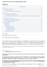 Verfahrenshinweise der Ausländerbehörde Berlin VAB A 6 Inhaltsverzeichnis A.6. Visum ....................................................................................................................................................................... 49 6.0. Allgemeines zum Visakodex .................................................................................................................................... 49 6.0.1. Visums-Kategorien ......................................................................................................................................... 49 6.0.2. Reiserechte innerhalb des Schengenraumes ............................................................................................... 50 6.1. frei ........................................................................................................................................................................... 50 6.2. Zur Verlängerung von Schengenvisa ...................................................................................................................... 50 6.2.1. Verlängerung des Schengen-Visums ............................................................................................................. 51 6.2.2. Verlängerung des Schengenvisums um bis zu drei weitere Monate innerhalb des Sechsmonatszeitraums ...... 52 6.s.1. Beseitigung von Schengen-Visa ........................................................................................................................... 52 Annullierung und Aufhebung von Schengen-Visa .................................................................................................... 53 Rechtsmittel gegen Beseitigung eines Visums ........................................................................................................ 54 6.s.2. Visa-Informationssystem - VIS - ............................................................................................................................ 54 6.s.3. Visawarndatei ....................................................................................................................................................... 55 1. Allgemeines .......................................................................................................................................................... 55 2. Nutzende Stellen .................................................................................................................................................. 56 3. Anwendung durch die ABH .................................................................................................................................. 56 3.1. Übermittlingspflichten ................................................................................................................................. 56 3.2. Anlassbezogene Abfrage ........................................................................................................................... 56 3.3. Vorgehen im Trefferfall ............................................................................................................................... 57 4. Auskunftsrecht Betroffener ................................................................................................................................... 57 A.6. Visum ( SchutzberArb; 17.10.2013; 26.05.2015 ) 6.0. Allgemeines zum Visakodex Am 05.10.2009 ist die Verordnung (EG) Nr. 810/2009 - der sog. Visakodex - in Kraft getreten. Diese Verordnung findet seit dem 05.04.2010 in den Schengen-Staaten (vgl. A.2.5. ) grundsätzliche Anwendung. Am 05.04.2010 in Kraft getreten ist darüber hinaus die Verordnung (EU) Nr. 265/2010 vom 25.03.2010 zur Änderung des Übereinkommens zur Durchführung des Übereinkommens von Schengen und der VO (EG) Nr. 562/2006 in Bezug auf den Verkehr von Personen mit einem Visum für den längerfristigen Aufenthalt, mit der u.a. Art. 18 und Art. 21 des SDÜ geändert wurden. Der Visakodex ersetzt u.a. Art. 9 bis 17 des Schengener Durchführungsübereinkommens (SDÜ) und die Gemeinsamen Konsularischen Instruktionen (GKI. 6.0.1. Visums-Kategorien Folgende Visums-Kategorien existieren nunmehr noch: A - Flughafentransitvisum (Visum zur Durchreise durch die internationalen Transitzonen eines oder mehrerer Flughäfen der Mitgliedstaaten), C - Schengen-Visum (Visum für die Durchreise durch das Hoheitsgebiet der Schengen-Staaten oder einen geplanten Aufenthalt in diesem Gebiet von höchstens 90 Tage in einem Zeittraum von 180 Tagen oder für die Durchreise durch die internationalen Transitzonen der Flughäfen von Mitgliedstaaten (C-Visum mit dem Zusatz "TRANSIT"), D - Nationales Visum für den längerfristigen Aufenthalt für Deutschland, das den Inhaber innerhalb der Gültigkeit berechtigt, sich wie mit einem nationalen Aufenthaltstitel bis zu 90 Tage in einem Zeittraum von 180 Tagen frei im Hoheitsgebiet der anderen Mitgliedstaaten zu bewegen. Das B-Visum und das Hybridvisum (D+C) alten Rechts sowie Sammelvisa sind mit Inkrafttreten des 2. Dieses PDF wurde erstellt am: 05.01.2016 Seite 49 von 727