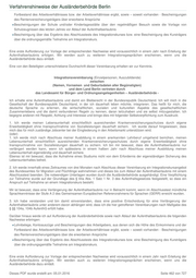 Verfahrenshinweise der Ausländerbehörde Berlin des Rentenversicherungsträgers über die erworbenen Ansprüche Bescheinigungen der Schule und/oder Kindertagesstätte über den regelmäßigen Besuch sowie die Vorlage von Schulzeugnissen des letzten Jahres vor Ablauf der Aufenthaltserlaubnis Bescheinigung über das Ergebnis des Abschlusstests des Integrationskurses bzw. eine Bescheinigung des Kursträgers über die ordnungsgemäße Teilnahme am Integrationskurs. Eine erste Aufforderung zur Vorlage der entsprechenden Nachweise wird voraussichtlich in einem Jahr nach Erteilung der Aufenthaltserlaubnis erfolgen. Wir werden auch zu weiteren Integrationsgesprächen erscheinen, wenn uns die Ausländerbehörde dazu einlädt. Eine von den Beteiligten unterschriebene Durchschrift dieser Vereinbarung erhalten wir zur Kenntnis. ……………………………… ……………………………………… gebilligt und Kenntnis genommen verlesen und erläutert 104a.s.3. Statistik Monatlich statistisch zu erfassen sind auch nach dem 31.12.2009 und bis zur abschließenden Bearbeitung aller vor dem 01.01.2010 gestellten Anträge auf Ersterteilung a. die Zahl der Anträge auf Ersterteilung: b. die Zahl der Ablehnungen der AE, insg.: wg. Passpflicht: wg. mangelnder Duldung bzw. Ausreisepflicht zum 01.07.2007: wg. wirtschaftl. Gründe: wg. Täuschung, vorsätzlichem Hinauszögern der Ausreise: wg. Ausweisungsgründen u.ä. Weiter sind ab 01.01.2010 nach einer bundeseinheitlichen Vorgabe monatlich statistisch zu erfassen die Zahl der Verlängerungsanträge, die Anzahl der Verlängerungen (Gesamt sowie nach Rechtsgrundlagen bzw. Fallkategorien des IMK- Beschlusses vom 3./4.12.2010) die Zahl der Ablehnungen (Gesamt sowie gesondert die, bei denen kein hinreichendes Bemühen zur Lebensunterhaltssicherung nachgewiesen wurde, oder es an den allgemeinen Erteilungsvoraussetzungen des § 104 a Abs. 1 S. 1 Nr. 1 -6, Abs. 3 fehlte die Zahl der sonstigen Erledigungen. Dieses PDF wurde erstellt am: 05.01.2016 Seite 464 von 727