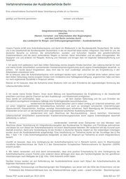 Verfahrenshinweise der Ausländerbehörde Berlin Fortbestand des Arbeitsverhältnisses bzw. der Arbeitsverhältnisse ergibt, sowie – soweit vorhanden - Bescheinigungen des Rentenversicherungsträgers über erworbene Ansprüche Bescheinigungen der Schule und/oder Kindertagesstätte über den regelmäßigen Besuch sowie die Vorlage von Schulzeugnissen des letzten Jahres vor Ablauf der Aufenthaltserlaubnis Bescheinigung über das Ergebnis des Abschlusstests des Integrationskurses bzw. eine Bescheinigung des Kursträgers über die ordnungsgemäße Teilnahme am Integrationskurs. Eine erste Aufforderung zur Vorlage der entsprechenden Nachweise wird voraussichtlich in einem Jahr nach Erteilung der Aufenthaltserlaubnis erfolgen. Wir werden auch zu weiteren Integrationsgesprächen erscheinen, wenn uns die Ausländerbehörde dazu einlädt. Eine von den Beteiligten unterschriebene Durchschrift dieser Vereinbarung erhalten wir zur Kenntnis. Integrationsvereinbarung (Einzelpersonen, Auszubildende) zwischen (Namen, Vornamen und Geburtsdaten aller Begünstigten) und dem Land Berlin vertreten durch das Landesamt für Bürger- und Ordnungsangelegenheiten – Ausländerbehörde - Ich erhalte eine Aufenthaltserlaubnis und damit ein Bleiberecht in der Bundesrepublik Deutschland. Ich will mich in die Gesellschaft der Bundesrepublik Deutschland, in der ich dauerhaft leben möchte, integrieren. Das heißt für mich, die deutsche Sprache zu erlernen, die wirtschaftlichen, sozialen und kulturellen Aspekte des gesellschaftlichen Zusammenlebens und die damit verbundenen Regeln zu kennen, daran teilzuhaben und sie selbst mitzugestalten. Ich begegne anderen mit Respekt, Achtung und Interesse und bringe dies mit folgender Selbstverpflichtung zum Ausdruck: 1. Ich werde meinen Lebensunterhalt einschließlich ausreichenden Krankenversicherungsschutzes durch eigene Erwerbstätigkeit ohne Inanspruchnahme von Sozialleistungen dauerhaft sichern. Ich wurde darauf hingewiesen, dass mich das für mich zuständige Jobcenter bei der Eingliederung in den Arbeitsmarkt unterstützen wird. (oder) 1. Ich werde mich nach Abschluss meiner Ausbildung in einem anerkannten Lehrberuf umgehend bemühen, meinen Lebensunterhalt einschließlich ausreichenden Krankenversicherungsschutzes durch eigene Erwerbstätigkeit ohne Inanspruchnahme von Sozialleistungen dauerhaft zu sichern. Ich bin mir bewusst, dass die Aufenthaltserlaubnis nur verlängert werden kann, wenn ich spätestens in einem halben Jahr nach Abschluss meiner Ausbildung meinen Lebensunterhalt eigenständig und dauerhaft sichere. Ebenso ist mir bewusst, dass die Aufnahme eines Studiums nicht von dem Erfordernis der eigenständigen Sicherung des Lebensunterhaltes befreit. 2. Ich werde innerhalb eines Zeitraumes von drei Monaten nach Abschluss dieser Vereinbarung ein Integrationskursangebot des Bundesamtes für Migration und Flüchtlinge wahrnehmen und dieses bis zum Ablauf der Aufenthaltserlaubnis mit einem Abschlusstest beenden. Die notwendigen Unterlagen wurden durch die Ausländerbehörde ausgehändigt. Eine Verpflichtung zur Teilnahme wurde auf der Grundlage des § 44a Abs. 1 Satz 1 Nr. 3 des Aufenthaltsgesetzes festgestellt, so dass ein Anspruch auf Teilnahme an einem Integrationskurs besteht. Mir ist bewusst, dass eine Verlängerung der Aufenthaltserlaubnis nur in Betracht kommt, wenn im Abschlusstest mündliche Sprachkenntnisse der Stufe A 2 des Gemeinsamen Europäischen Referenzrahmens für Sprachen (GERR) erreicht wurden. 3. Ich habe verstanden und bin damit einverstanden, dass eine positive Entscheidung für eine Verlängerung der Aufenthaltserlaubnis unter anderem davon abhängen wird, dass ich die hier getroffenen Vereinbarungen nach Maßgabe des § §§ 104a, 104b AufenthG erfüllt habe. Darüber hinaus werde ich auf Aufforderung der Ausländerbehörde sowie nach Ablauf der Aufenthaltserlaubnis die folgenden Nachweise erbringen: Lohnbelege, Kontoauszüge und Bescheinigungen des Arbeitgebers, aus denen sich die Höhe des Einkommens und der Fortbestand des Arbeitsverhältnisses bzw. der Arbeitsverhältnisse ergibt, sowie – soweit vorhanden - Bescheinigungen des Rentenversicherungsträgers über die erworbenen Ansprüche Bescheinigung über das Ergebnis des Abschlusstests des Integrationskurses bzw. eine Bescheinigung des Kursträgers über die ordnungsgemäße Teilnahme am Integrationskurs. Eine erste Aufforderung zur Vorlage der entsprechenden Nachweise wird voraussichtlich in einem Jahr nach Erteilung der Aufenthaltserlaubnis erfolgen. Wir werden auch zu weiteren Integrationsgesprächen erscheinen, wenn uns die Ausländerbehörde dazu einlädt. Dieses PDF wurde erstellt am: 05.01.2016 Seite 462 von 727