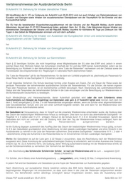 Verfahrenshinweise der Ausländerbehörde Berlin Reisendenliste in diesen Fällen immer mit dem Risiko verbunden ist, dass die zuständigen Behörden in den Mitgliedstaaten - aus welchen Gründen auch immer - diese Liste nicht akzeptieren und deshalb Schwierigkeiten bei Einreise und Aufenthalt entstehen können. Nach dem Ausfüllen der Liste ist diese einem Beauftragten der Schule mit dem Hinweis auszuhändigen, dass die von der Schulleitung geforderten Angaben (Zeilen 1 - 4 sowie linkes Kästchen darunter) unbedingt einzutragen und vom Schulleiter - persönlich oder durch den allgemein bestellten Vertreter - gegenzuzeichnen sind. Merke: Die Eintragung und Gegenzeichnung hat gem. Nr. 3.3.6 AufenthG- VwV grundsätzlich vor der Bestätigung der Liste durch die Ausländerbehörde zu erfolgen. Die Gebühr für die Bestätigung einer Reisendenliste beträgt 5,00 € pro Person (§ 48 Abs. 1 Nr. 7). Über die ausgegebenen Vordrucke ist ein Nachweis zu führen, in dem das Ausstellungsdatum und der Name der Schule anzugeben ist. Eine Ablichtung der ausgestellten "Listen der Reisenden" ist in Stehordnern zu sammeln und 1 Jahr aufzubewahren. Ob die Reiseländer, die EU- und EWR - Staaten sind, die "Liste der Reisenden" anerkennen, ist jeweils vor Reiseantritt durch die Schule abzuklären. Lehrer, die sich wegen der Ausstellung einer Liste der Reisenden zum Zwecke von Klassenreisen informieren, sind auf diesen Umstand hinzuweisen. B.AufenthV.23. Befreiung für ziviles Flugpersonal frei B.AufenthV.24. Befreiung für Seeleute frei B.AufenthV.25. Befreiung in der internationalen zivilen Binnenschifffahrt frei B.AufenthV.26. Transit ohne Einreise; Flughafentransitvisum Anlage C wurde neu gefasst B.AufenthV.27. Befreiung für Personen bei Vertretungen ausländischer Staaten 27.0. Grundsatz § 27 AufenthV sieht Befreiungen für Personen vor, die sich im Zusammenhang mit der Tätigkeit der Vertretungen auswärtiger Staaten im Bundesgebiet aufhalten, und die nicht bereits völkerrechtlich und wegen § 1 Absatz 2 Nummer 2 oder 3 aus dem Anwendungsbereich des gesamten Aufenthaltsrechts ausgenommen sind. Laut Rundnote 6/2010 des Auswärtigen Amtes unterliegt die Beschäftigung von Unionsbürgern seit dem 16.02.2010 grundsätzlich nicht mehr der Genehmigungspflicht. Auf Unionsbürger und ihre freizügigkeitsberechtigten Familienangehörigen, die analog § 27 Nr. 2, 3 und 5 an Auslandsvertretungen beschäftigt sind oder waren, findet somit das FreizügG/EU Anwendung. Voraufenthaltszeiten im Rahmen von Nr. 2, 3 und 5 mit einem Protokollausweis des Auswärtigen Amtes sind folgerichtig auf die Zeiten eines ständig rechtmäßigen Aufenthalts gem. § 4a FreizügG/EU anzurechnen. Gleiches gilt für Diplomaten und andere völkerrechtlich im Zusammenhang mit diplomatischen und konsularischen Tätigkeiten bevorrechtigte Personen ( vgl. A.1.2.0 ). 27.1. Befreite ...weggefallen... Laut Ziffer 5.3 der aktuellen Protokollrichtlinien des Auswärtigen Amtes vom 1. Januar 2013 sind in Deutschland angeworbene Ortskräfte bei einer Beschäftigung in einer diplomatischen oder berufskonsularischen Vertretung grundsätzlich nicht mehr von einer Aufenthaltspflicht befreit (anders noch die Fassung der Protokollrichtlinien vom 1. Januar 2006, nach denen solchen Ortskräften Protokollausweise zum Nachweis ihrer Befreiung vom Erfordernis eines Aufenthaltstitels ausgestellt werden konnten). Für die Erteilung eines Titels in Deutschland angeworbenen Ortskräften gelten nunmehr die Vorschriften des Aufenthaltsgesetzes. Die Möglichkeit zur Anwerbung eigener Staatsangehöriger im Entsendestaat („unechte Ortskräfte“) wird den ausländischen Vertretungen in Deutschland zukünftig nicht mehr eingeräumt. Mit dem Tag des Inkrafttretens der Protokollrichtlinien besteht nur noch die Möglichkeit der Einstellung auf dem deutschen Arbeitsmarkt angeworbener („echter“) Ortskräfte, die im Besitz Dieses PDF wurde erstellt am: 05.01.2016 Seite 484 von 727