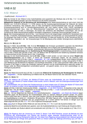 Verfahrenshinweise der Ausländerbehörde Berlin VAB A 53 Inhaltsverzeichnis A.53. Ausweisung ............................................................................................................................. 354 53.0. Grundsätzliches ................................................................................................................ 354 53.1. Ausweisungstatbestand .................................................................................................... 354 53.1.1. Ausweisungsinteresse und Gefahrenprognose .................................................... 354 53.1.1.1. Rechtsgutverletzung ..................................................................................... 354 53.1.1.2. Gefahrenprognose (spezialpräventive Ausweisung) .................................... 355 53.1.1.3. Generalpräventive Ausweisung .................................................................... 356 53.1.1.4. Gewichtung des Ausweisungsinteresses ..................................................... 356 53.1.2. Bleibeinteressen ................................................................................................... 356 53.1.3 Abwägung ............................................................................................................. 356 53.1.4. Maßgeblicher Zeitpunkt für die Beurteilung der Sach- und Rechtslage ................. 357 53.1.5. Wiederaufgreifen des Verfahrens / Rücknahme bestandskräftiger Ausweisungen ...... 357 53.2. Abwägungskriterien .......................................................................................................... 358 53.3. Ausweisungsschutz bei bestimmten Personengruppen ................................................... 358 53.4. Vorübergehender Ausschluss der Ausweisung ................................................................ 359 A.53. Ausweisung ( GErlAW, 16.01.2017; 16.05.2017 ) 53.0. Grundsätzliches Mit dem Gesetz zur Neubestimmung des Bleiberechts und des Aufenthaltsbeendigungsrechts ist das Ausweisungsrecht grundlegend neu geregelt worden. Anstelle des bisherigen Stufensystems, das zwischen Ist-, Regel- und Ermessensausweisung unterschied, tritt nunmehr eine Ausweisung, die auf der umfassenden und ergebnisoffenen Abwägung aller Umstände des Einzelfalls beruht. Ergibt die Abwägung, dass das öffentliche Ausweisungsinteresse das Bleibeinteresse des Betreffenden im Bundesgebiet überwiegt, ist die Ausweisung zwingend zu verfügen. Diese Verhältnismäßigkeitsabwägung ist gerichtlich voll überprüfbar, da eine behördliche Ermessensprüfung nicht mehr stattfindet. Durch die gesetzliche Neubestimmung soll dem Umstand Rechnung getragen werden, dass die höchstrichterliche Rechtsprechung in der jüngeren Vergangenheit die Rechtsfolge einer zwingenden oder regelmäßigen Ausweisung mit Blick auf die Konventionsrechte aus Art. 8 Abs. 1 EMRK erheblichen Einschränkungen unterworfen hat. Die aufenthaltsbeendende Entscheidung soll der vollen gerichtlichen Überprüfbarkeit unterworfen werden (vgl. hierzu 53.2. und 55.) 53.1. Ausweisungstatbestand § 53 Abs. 1 stellt nunmehr die alleinige Rechtsgrundlage und den Grundtatbestand für jede Ausweisung dar. Die in § 54 Abs. 1 und Abs. 2 enthaltenen Regelungen beinhalten demgegenüber keine Definition des öffentlichen Ausweisungsinteresses, sondern setzen dieses gesetzessystematisch voraus. Sie enthalten eine gesetzliche Gewichtung des Ausweisungsinteresses für die durchzuführende Abwägung mit den Bleibeinteressen des Betreffenden. 53.1.1. Ausweisungsinteresse und Gefahrenprognose Ein Ausweisungsinteresse besteht nach dem Gesetzeswortlaut, wenn der weitere Aufenthalt des Ausländers eine Gefahr für die öffentliche Sicherheit und Ordnung, die freiheitliche demokratische Grundordnung oder sonstige erhebliche Interessen der Bundesrepublik darstellt. Eine Gefährdung, die ein Ausweisungsinteresse begründet, kann – soweit kein Fall von § 53 Abs. 3 vorliegt – weiterhin sowohl spezial- als auch generalpräventiv begründet werden. 53.1.1.1. Rechtsgutverletzung Die Begriffe der öffentlichen Sicherheit und Ordnung sind dabei im polizeirechtlichen Sinn zu verstehen. Öffentliche Sicherheit im Sinne des Gefahrenabwehrrechts ist die Unverletzlichkeit der objektiven Rechtsordnung, der subjektiven Rechte und Rechtsgüter des einzelnen sowie der Einrichtungen und Veranstaltungen des Staates und der sonstigen Träger der Hoheitsgewalt. Demgegenüber umfasst die öffentliche Ordnung die Gesamtheit der ungeschriebenen Normen, die innerhalb eines bestimmten räumlichen Bereichs unabdingbare Voraussetzung für ein gedeihliches Miteinander sind. Die freiheitlich demokratische Grundordnung stellt nach der ständigen Rechtsprechung des Bundesverfassungsgerichts eine Ordnung dar, die unter Ausschluss jedweder Gewalt oder Willkürherrschaft eine rechtsstaatliche Herrschaftsordnung auf der Grundlage der Selbstbestimmung des Volkes nach dem Willen der jeweiligen Mehrheit und der Freiheit und Gleichheit darstellt. Hierunter zu fassen sind die Achtung vor dem im Grundgesetz verbrieften Menschenrechten vor allem des Rechts auf Leben, der Freiheit der Person und der Entfaltung der Persönlichkeit, der Volkssouveränität, die Gewaltenteilung, die Dieses PDF wurde erstellt am: 23.10.2017 Seite 354 von 791