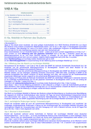Verfahrenshinweise der Ausländerbehörde Berlin VAB A 16a Inhaltsverzeichnis A.16a. Mobilität im Rahmen des Studiums .................................. 131 Änderungsdatum ................................................................... 585 16a.1 Mitteilung über die Absicht zur kurzfristigen Mobilität . 131 16a.2. Erwerbstätigkeit .......................................................... 131 16a.3. nachträgliche Änderungen bezügl. Voraussetzungen ...... 131 16a.4. Wechsel in Aufenthaltstitel ......................................... 131 16a.5. Wirkung der Versagung ............................................. 132 16a.6. Bescheinigung über kurzfristige Mobilität ................... 132 A.16a. Mobilität im Rahmen des Studiums Änderungsdatum ( RiLiUmsG2017 ) 16a.0. § 16a erlaubt einem Ausländer, der einen gültigen Aufenthaltstitel i.S.d. REST-Richtlinie 2016/801/EU zum Zweck des Studiums eines anderen europäischen Mitgliedsstaats besitzt, sich für bis zu 360 Tagen im Bundesgebiet aufzuhalten und zu studieren. Dies allerdings nur, wenn er an einem Unions- oder multilateralen Programm mit Mobilitätsmaßnahmen teilnimmt oder für ihn eine Vereinbarung zwischen zwei oder mehr Hochschulen gilt. Eines Aufenthaltstitels i.S.d. § 4 AufenthG bedarf es hierfür – anders als bei dem nunmehr weggefallenen § 16 Abs. 6 a.F. – nicht, sondern nur einer Mitteilung über den geplanten Aufenthalt nach § 16a Abs. 1 AufenthG. Zweck des sog. Mitteilungsverfahrens ist es, zum einen Kenntnis darüber zu erlangen, ob und durch wen die Möglichkeit des Kurzzeitaufenthalts genutzt wird, und zum anderen, mögliche Ablehnungsgründe nach § 20c Abs. 3 zu prüfen. Einen Familiennachzug zum kurzfristig mobilen Studierenden gibt es nicht. Zu den Übermittlungspflichten im Zusammenhang mit der Ablehnung einer kurzfristigen Mobilität vgl. A.91d.5. 16a.1 Mitteilung über die Absicht zur kurzfristigen Mobilität Normadressat für die Absätze 1 und 2 des § 16a ist allein das BAMF als nationale Kontaktstelle Deutschlands bzw. der Ausländer und die aufnehmende Bildungseinrichtung im Bundesgebiet. Insofern sind diese Absätze für die ausländerbehördliche Tätigkeit ohne praktische Relevanz. Vom Verfahren her muss die aufnehmende Bildungseinrichtung im Bundesgebiet dem BAMF die Absicht zur kurzfristigen Mobilität mitteilen und die Unterlagen vollständig einreichen (Faxnummer +49911943-1000). Zuständig im BAMF ist die nationale Kontaktstelle Das nähere Verfahren ist derzeit allerdings noch offen. Alle irrtümlich bei der Ausländerbehörde eingehenden Mitteilungen werden ungeprüft an die aufnehmende Bildungseinrichtung zurückgegeben. Nach Eingang und Prüfung leitet die Nationale Kontaktstelle des BAMF die vollständigen Mitteilungen in deutscher Sprache an die zuständige Ausländerbehörde (am Ort des geplanten Aufenthalts im Bundesgebiet) weiter (zu Art und Umfang der Unterlagen s. § 16a Abs. 1 sowie § 91d Abs. 1). Hinsichtlich der Lebensunterhaltssicherung für kurzfristig mobile Studierende gilt § 2 Abs. 3 Satz 5 analog. Nach Absatz 1 Satz 2 hat die Mitteilung grundsätzlich zu dem Zeitpunkt zu erfolgen, in dem der Aufenthaltstitel gemäß der REST-Richtlinie in dem anderen Mitgliedstaat beantragt wird, d.h. im Visumsverfahren. Entsteht die Absicht zur kurzfristigen Mobilität erst später, hat die Mitteilung zu erfolgen, sobald die Absicht entsteht. 16a.2. Erwerbstätigkeit Das Recht zur kurzfristigen Mobilität im Rahmen des Studiums umfasst die Berechtigung zur Ausübung einer Beschäftigung, die insgesamt ein Drittel der Aufenthaltsdauer (also maximal 120 Tage, bei kürzer Aufenthaltsdauer entsprechend kürzer) nicht überschreiten darf, sowie zur Ausübung studentischer Nebentätigkeiten. Das Recht zur Erwerbstätigkeit kann der Ausländer mittels der vom BAMF ausgestellten Bescheinigung über die kurzfristige Mobilität nachweisen (vgl. A.16a.6) 16a.3. nachträgliche Änderungen bezügl. Voraussetzungen Sowohl der Ausländer selbst als auch die aufnehmende Bildungseinrichtung im Bundesgebiet sind verpflichtet, der zuständigen Ausländerbehörde Änderungen in Bezug auf die Voraussetzungen der kurzfristigen Mobilität mitzuteilen. Bei nachträglichem Wegfall der Voraussetzungen wird eine Versagung i.d.R. nicht in Betracht kommen, da die 30-Tages-Frist des § 20c Abs. 3 Satz 2 meist abgelaufen sein dürfte. 16a.4. Wechsel in Aufenthaltstitel Erwirbt der Ausländer während seines Aufenthalts im Rahmen der kurzfristigen Mobilität einen deutschen Hochschulabschluss – und nur dann –, so ist die anschließende Erteilung eines Aufenthaltstitel zu einem beliebigen Zweck möglich. Ebenso kann ein Aufenthaltstitel zum Zweck der Suche eines angemessenen Arbeitsplatzes erteilt werden. § 16 Abs. 4 Satz 1 und § 16 Abs. 5 gelten entsprechend (vgl. dazu A.16.4.1. und A.16.5.0.) Erwirbt der Ausländer während seiner kurzfristigen Mobilität keinen deutschen Hochschulabschluss, ist ein Wechsel in einen anderen Aufenthaltstitel nicht möglich. Dass für diese Fallkonstellation § 39 Satz 1 Nr. 2 AufenthV nicht ausgeschlossen Dieses PDF wurde erstellt am: 08.08.2017 Seite 131 von 786