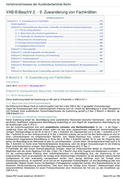 Verfahrenshinweise der Ausländerbehörde Berlin VAB B.BeschV.2. - 9. Zuwanderung von Fachkräften Inhaltsverzeichnis B.BeschV.2. - 9. Zuwanderung von Fachkräften .......................................................................................... 579 Änderungsdatum ................................................................................................................................... 585 B.BeschV.2. Hochqualifizierte, Blaue Karte, Fachkräfte mit inländischen Hochschulabschluss ........... 579 2.1.1 NE für Hochqualifizierte ......................................................................................................... 579 2.1.2 Blaue Karte ohne Zustimmungserfordernis .......................................................................... 579 2.1.3 Fachkräfte mit inländischem Hochschulabschluss ............................................................... 579 2.2 Blaue Karte EU mit Zustimmung .............................................................................................. 580 2.3 Sonstige Hochschulabsolventen .............................................................................................. 580 2.4 Entgeltgrenze Blaue Karte EU ................................................................................................. 580 B.BeschV.3. Führungskräfte .................................................................................................................. 580 B.BeschV.4. Leitende Angestellte und Spezialisten .............................................................................. 581 B.BeschV.5. Wissenschaft, Forschung und Entwicklung ...................................................................... 581 B.BeschV.6. Ausbildungsberufe ............................................................................................................ 582 B.BeschV.7. Absolventinnen und Absolventen deutscher Auslandsschulen ........................................ 582 B.BeschV.8. Betriebliche Aus- und Weiterbildung; Anerkennung ausländischer Berufsqualifikationen ...... 583 B.BeschV.9. Beschäftigung bei Vorbeschäftigungszeiten oder längerem Voraufenthalt ...................... 583 B.BeschV.2. - 9. Zuwanderung von Fachkräften Änderungsdatum (16.01.2017; 24.07.2017; RiLiUmsG 2017 ) B.BeschV.2. Hochqualifizierte, Blaue Karte, Fachkräfte mit inländischen Hochschulabschluss 2.1.1 NE für Hochqualifizierte Keiner Zustimmung bedarf die Zustimmung zur NE nach § 19 AufenthG, s. VAB.A.19.1.1. 2.1.2 Blaue Karte ohne Zustimmungserfordernis Die Erteilung einer Blauen Karte ist zustimmungsfrei unter den in den VAB.A.19a.1.2 geregelten Voraussetzungen. Liegen die Voraussetzungen einer zustimmungsfreien Erteilung nicht vor, kommt bei Beschäftigung in einem Mangelberuf und Vorliegen eines ausländischen Hochschulabschlusses die Zustimmung gemäß § 2 Abs. 2 BeschV in Betracht, vgl. VAB.B.BeschV 2.2.. 2.1.3 Fachkräfte mit inländischem Hochschulabschluss Keiner Zustimmung bedarf die Beschäftigung eines ausländischen Absolventen deutscher Hochschulen , wenn eine der beruflichen Qualifikation angemessene Beschäftigung beabsichtigt ist (zum Begriff der angemessenen Beschäftigung vgl. die Ausführungen unter A.16.4.2.). Von der Zustimmungsfreiheit sind auch ausländische Lehramts- und Rechtsreferendare für die – in der Regel – zweijährige Dauer des Referendariats erfasst, sofern sie über einen entsprechenden inländischen Hochschulabschluss verfügen. Rechtsgrundlage für die AE ist hier § 17 Abs. 1 AufenthG. Ein Zweckwechsel von § 16 Abs. 1 AufenthG zu § 17 Abs. 1 AufenthG ist vor dem Hintergrund des § 16 Abs. 2 AufenthG zulässig, weil es sich bei dem Referendariat um eine für einen Lehramtsanwärter mit entsprechendem Bachelor- bzw. Master-Abschluss bzw. Juristen mit 1. juristischen Staatsexamen angemessene Beschäftigung im Sinne des § 16 Abs. 4 AufenthG handelt. So ist zwar die Vergütung eher gering, die Beschäftigung als Referendar ist aber für Lehramtsanwärter / Juristen üblich. Dementsprechend findet auch § 16 Abs. 4 AufenthG zur Suche eines Referendariatsplatzes Anwendung, wenn die übrigen Voraussetzungen für die Erteilung dieser Aufenthaltserlaubnis vorliegen. Nach Beendigung des Referendariats gilt § 17 Abs. 3. IT-Fachkräfte, die über keinen Hochschulabschluss verfügen, haben bei entsprechendem Bedarf an Arbeitskräften die Möglichkeit nach der neuen Regelung in § 6 Abs. 2 Satz 1 Nr. 2 BeschV (neu) einen Zugang zum Arbeitsmarkt zu erhalten. Für die zustimmungsfreie Erteilung einer Aufenthaltserlaubnis zur Beschäftigung bzw. die Zustimmung für ein entsprechendes Visum ist grundsätzlich die Vorlage eines Arbeitsvertrages erforderlich. So der gesicherte Lebensunterhalt nachgewiesen ist oder anderweitig nachgewiesen werden kann, genügt allerdings auch die Vorlage einer Einstellungszusicherung. Ist zweifelhaft, ob es sich bei der angestrebten Erwerbstätigkeit, um eine Beschäftigung oder eine selbständige Tätigkeit handelt, können die Beteiligten (Vertragspartner) aufgefordert werden, eine Statusfeststellung bei der Deutschen Rentenversicherung durchzuführen. Dies kann etwa bei Vorlage eines Honorar-/ Arbeitsvertrages eines wissenschaftlichen Mitarbeiters mit einem Professor/Dozenten einer Hochschule der Fall sein (zu den Einzelheiten vgl. VAB.A.21.0.). Dieses PDF wurde erstellt am: 08.08.2017 Seite 579 von 786
