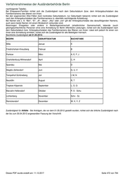 Verfahrenshinweise der Ausländerbehörde Berlin nachfolgende Tabelle). Bei Ehepaaren/Familien richtet sich die Zuständigkeit nach dem Geburtsdatum (bzw. dem Anfangsbuchstaben des Familiennamens) des älteren von ihnen. Bei den sogenannten 00er-Fällen (kein konkretes Geburtsdatum, nur Geburtsjahr bekannt) richtet sich die Zuständigkeit nach den Anfangsbuchstaben des Familiennamens (s. ebenfalls nachfolgende Aufstellung). Bei Namen wie z. A. “Ben”, “El”, „Al“, „Abou“, „Abu“ oder „von“ gilt der Anfangsbuchstabe des darauffolgenden Namens, auch wenn beide Namen mit einem Bindestrich verbunden sind. Beantragen Ehegatten oder andere in Bedarfsgemeinschaft (eheähnlicher Gemeinschaft) lebende (auch gleichgeschlechtliche) Personen ohne eine Anmeldung für Berlin öffentliche Leistungen, richtet sich die Zuständigkeit nach dem Geburtsdatum bzw. Anfangsbuchstaben des Familiennamens des Älteren von ihnen. Lässt sich jedoch für einen von ihnen eine Anmeldung ermitteln, richtet sich die Zuständigkeit für alle Beteiligten hiernach. Bezirkliche Zuständigkeit ab 01.05.2012: BEZIRK GEBURTSDATUM BUCHSTABE Mitte Januar K Friedrichshain-Kreuzberg Februar B Pankow März A, E, F, J Charlottenburg-Wilmersdorf April C, H Spandau Mai D Steglitz-Zehlendorf Juni G, U, V Tempelhof-Schöneberg Juli I, M, N Neukölln August R, T Treptow-Köpenick September L, O, Q Marzahn-Hellersdorf Oktober P, S - Schu Lichtenberg November Schv - Sz Reinickendorf Dezember W, X, Y, Z Zuständigkeit für Altfälle - Bei Anträgen, die vor dem 01.05.2012 gestellt wurden, richtet sich die örtliche Zuständigkeit nach der bis zum 30.04.2012 angewandten Fassung der Vorschrift: Dieses PDF wurde erstellt am: 11.12.2017 Seite 472 von 794